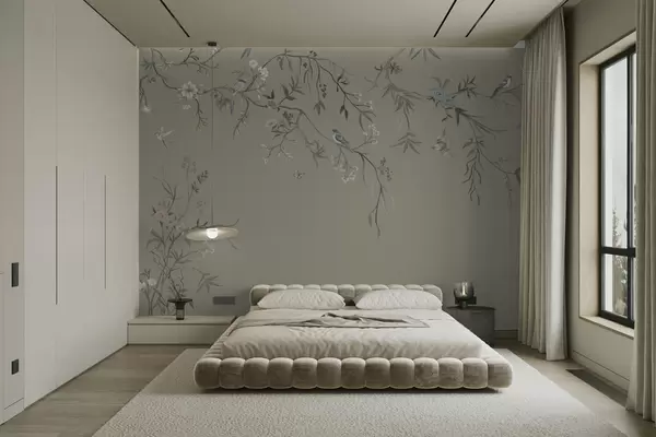 Fototapeten Blumenmuster mit Vögeln auf kühlem Hintergrund N° w05127v6