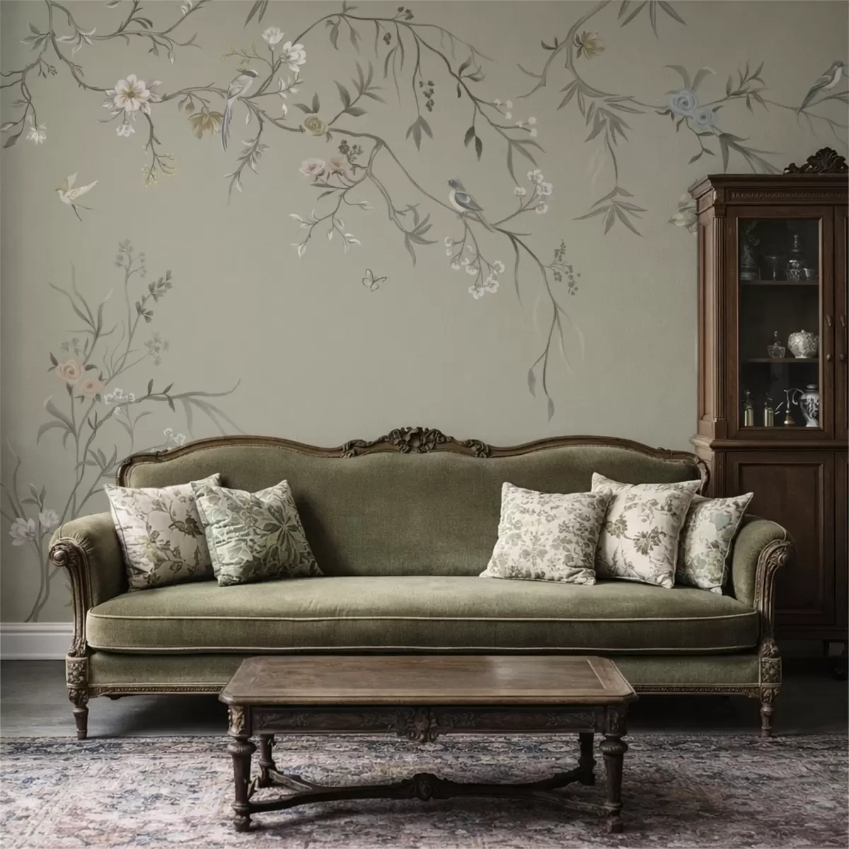 Fototapeten Blumenmuster mit Vögeln auf kühlem Hintergrund N° w05127v6