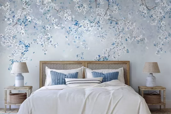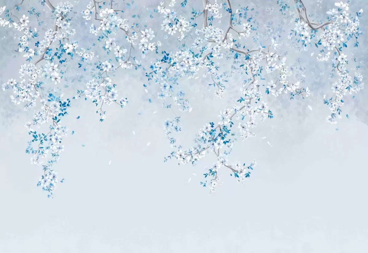 Fototapeten Zweige mit weißen und blauen Blüten vor einem kühlen Hintergrund N° w05129v2