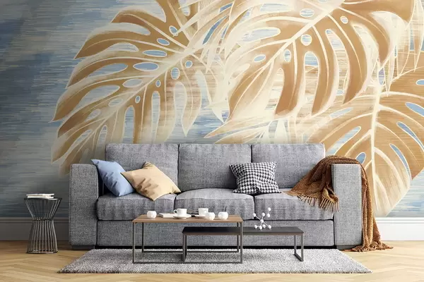 Fototapeten Blätter in hellen Sandtönen auf blauem Hintergrund N° w05130v1