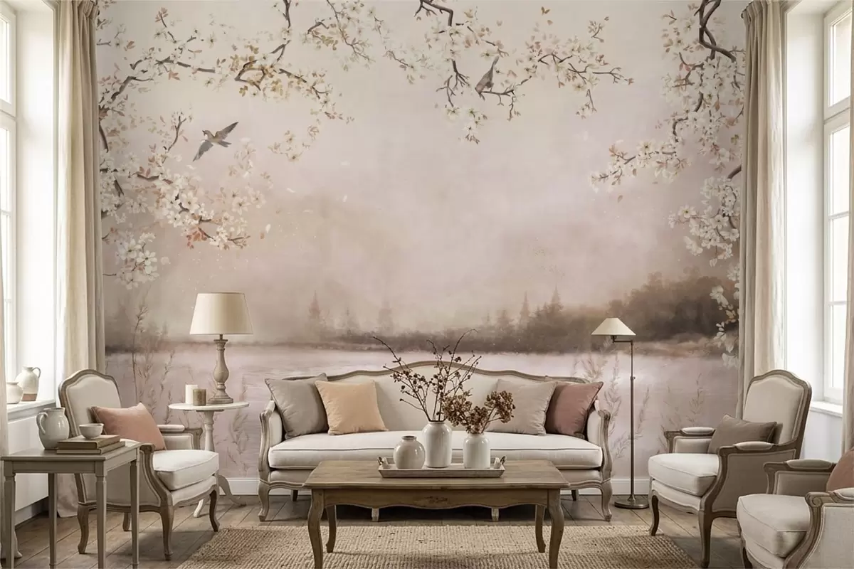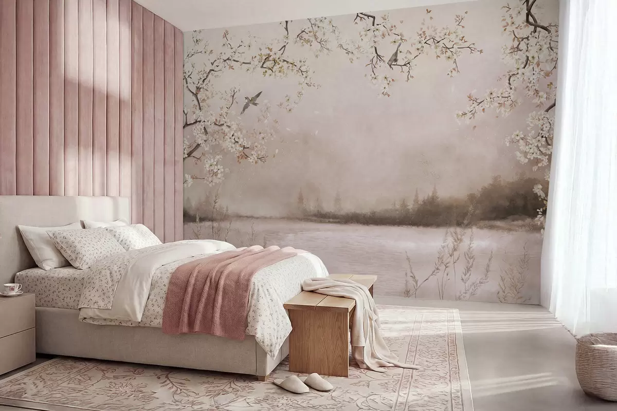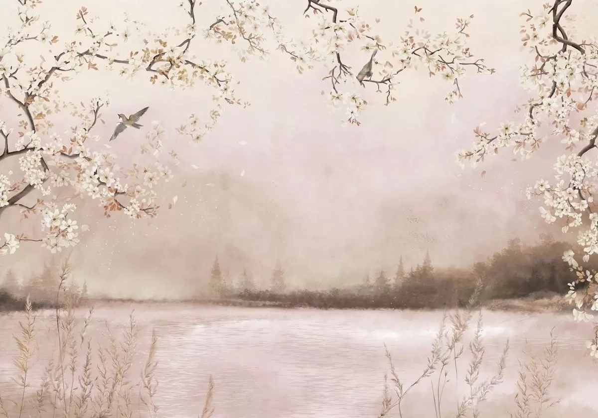 Fototapeten Blühende Zweige über einem ruhigen See mit Vögeln im Nebel N° w05155v1