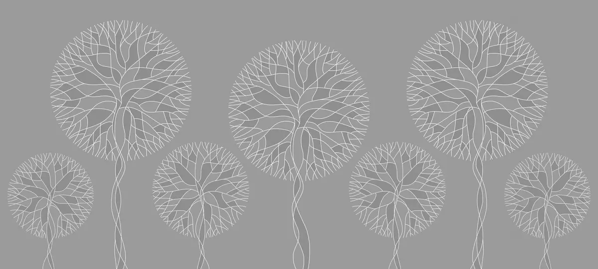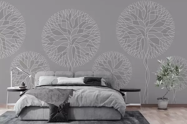 Fototapeten Fantastische lineare Bäume mit üppigen Kronen in mittleren Grautönen N° w05213v5