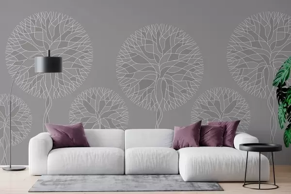 Fototapeten Fantastische lineare Bäume mit üppigen Kronen in mittleren Grautönen N° w05213v5