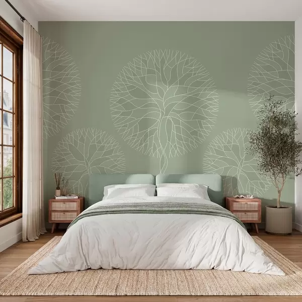 Fototapeten Fantasievolle lineare Bäume mit üppigen Kronen in hellgrünen Farbtönen N° w05213v6