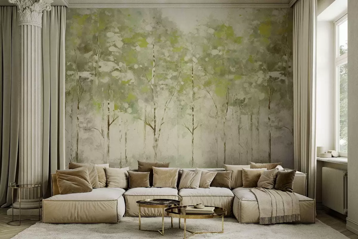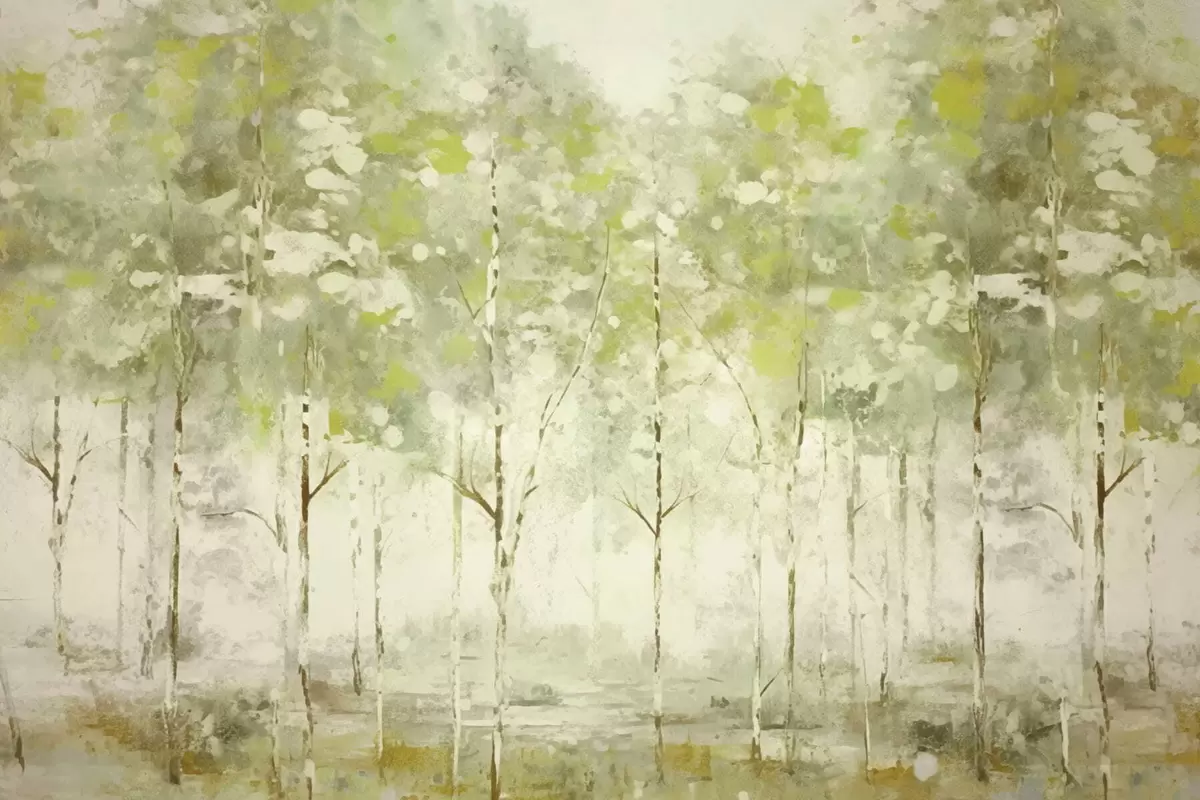 Fototapeten Stilisierter Wald mit schlanken Bäumen in Grüntönen N° w05221v1
