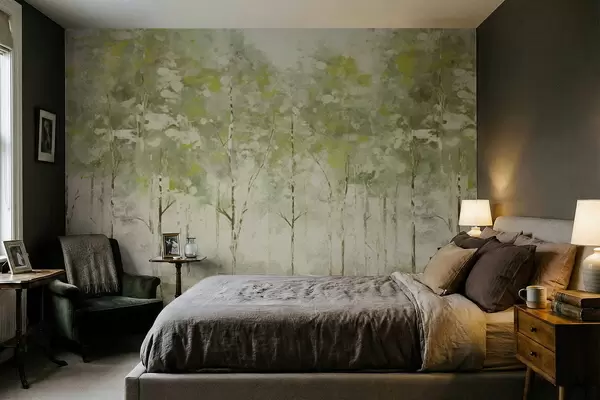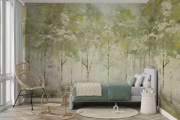 Fototapeten Stilisierter Wald mit schlanken Bäumen in Grüntönen N° w05221v1