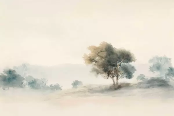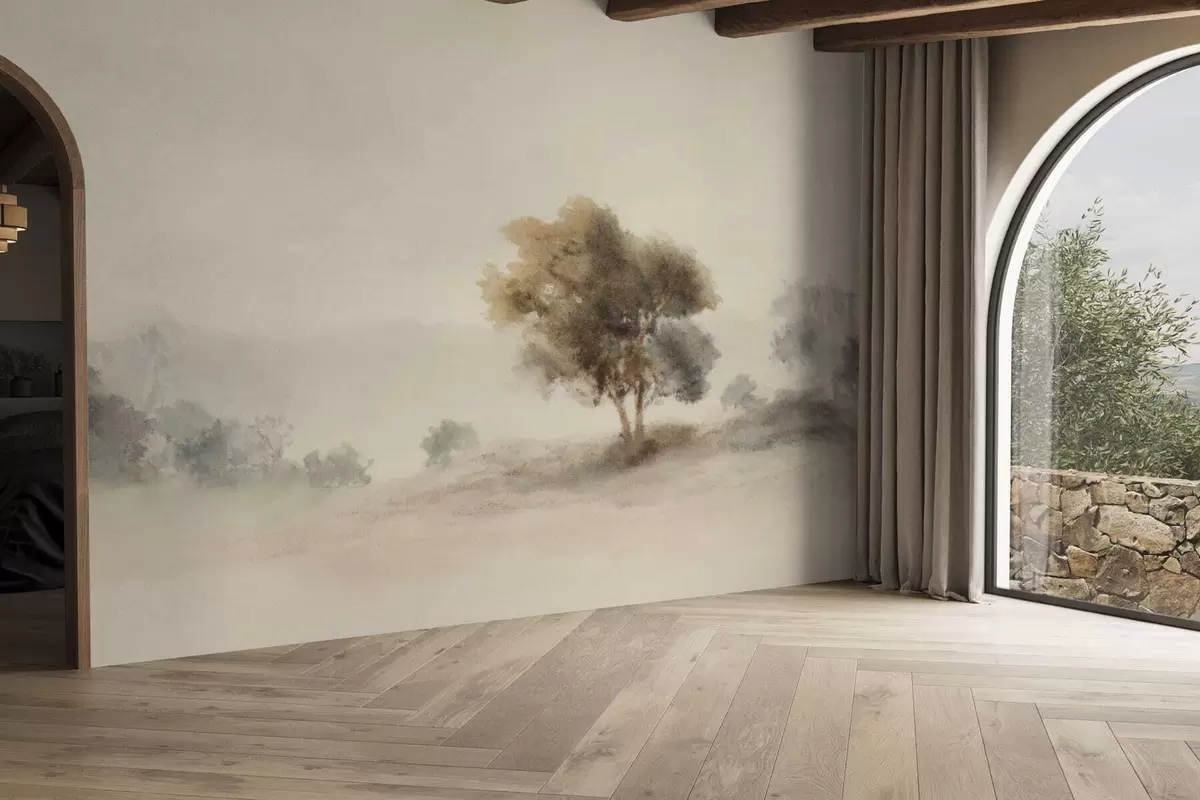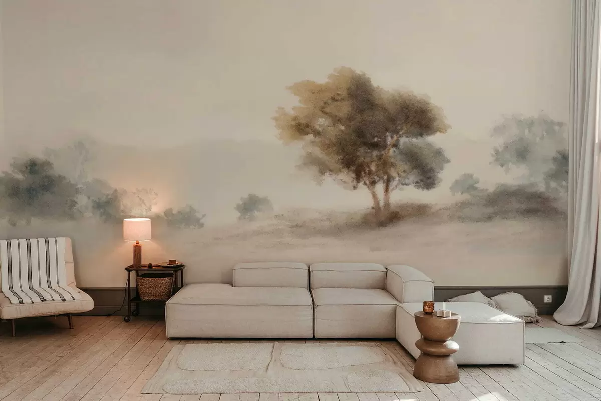 Fototapeten Minimalistische Landschaft mit einem einsamen Baum im Nebel N° w05223