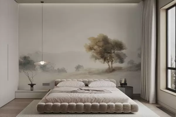 Fototapeten Minimalistische Landschaft mit einem einsamen Baum im Nebel N° w05223