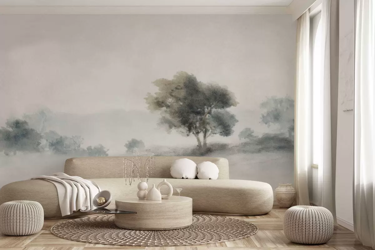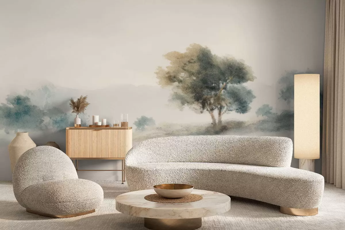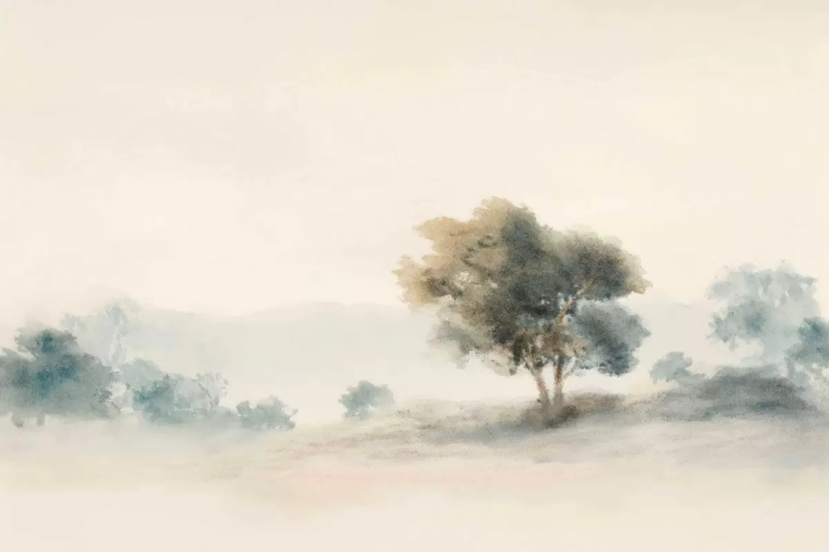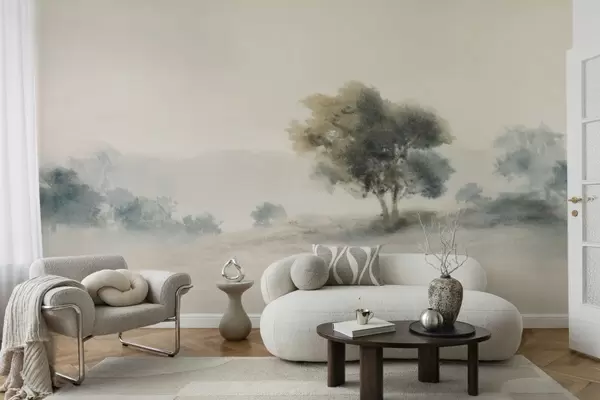 Fototapeten Ruhige Landschaft mit einem Baum und sanften, verschwommenen Formen N° w05223v1