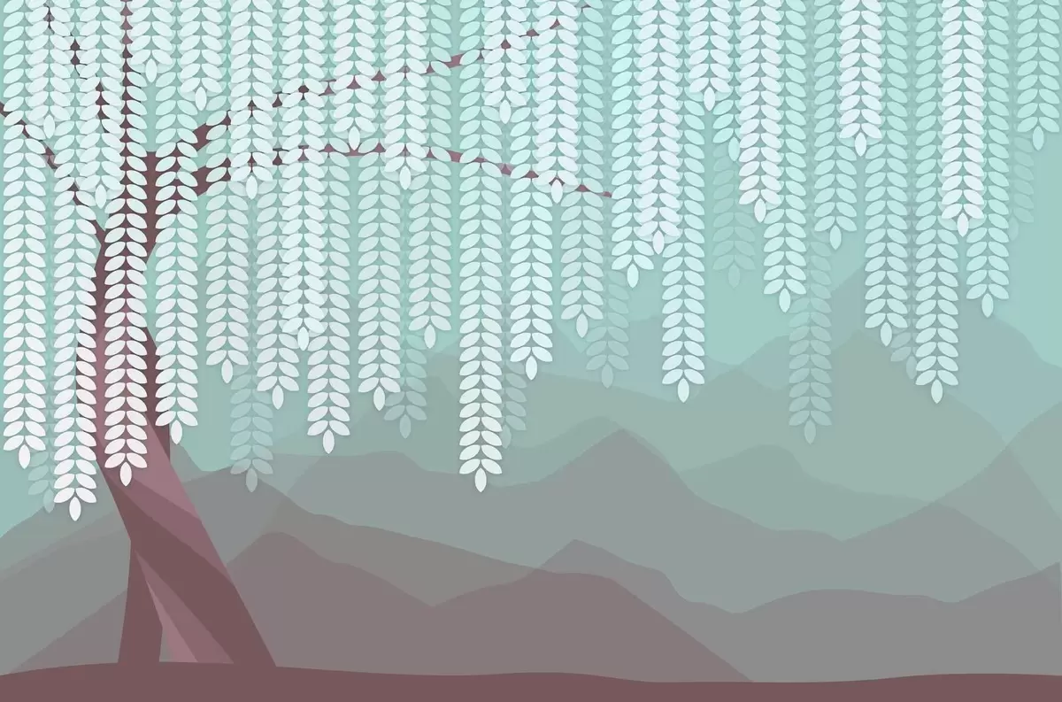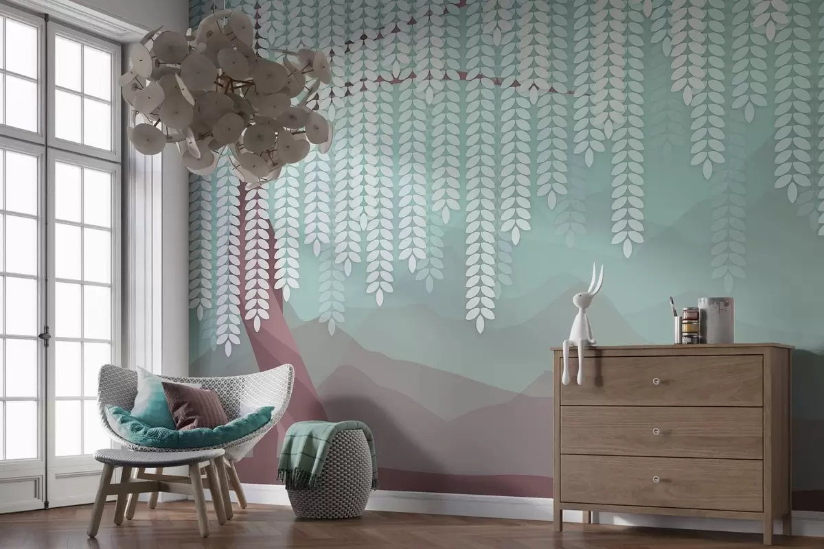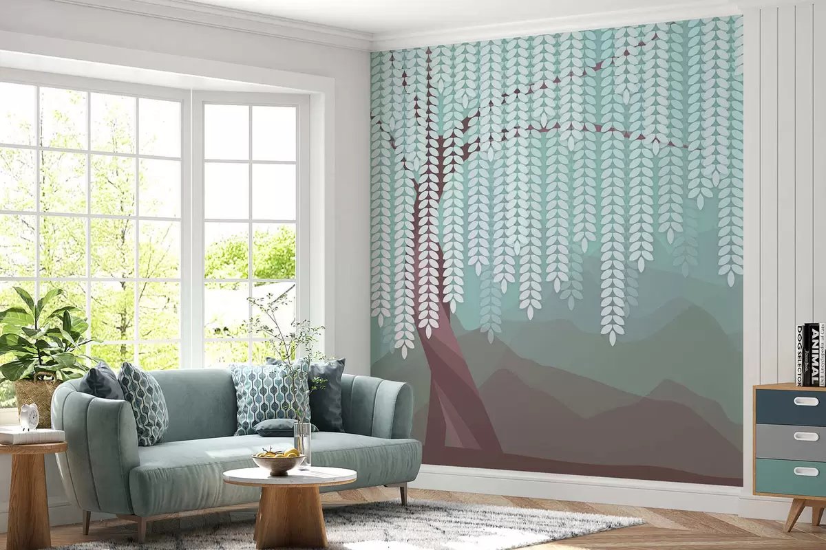 Fototapeten Stilisierter Weidenbaum mit herabhängenden Blättern vor dem Hintergrund minimalistischer Berge in Schokoladen- und Türkistönen N° w05232v1