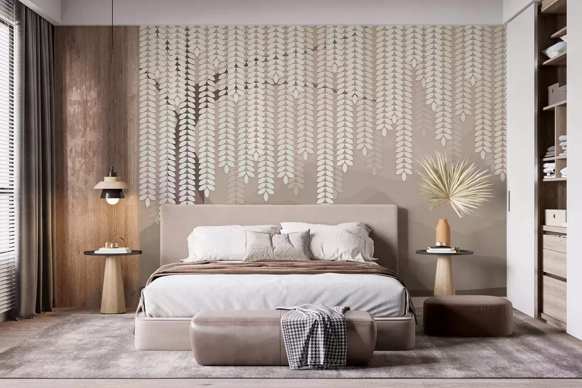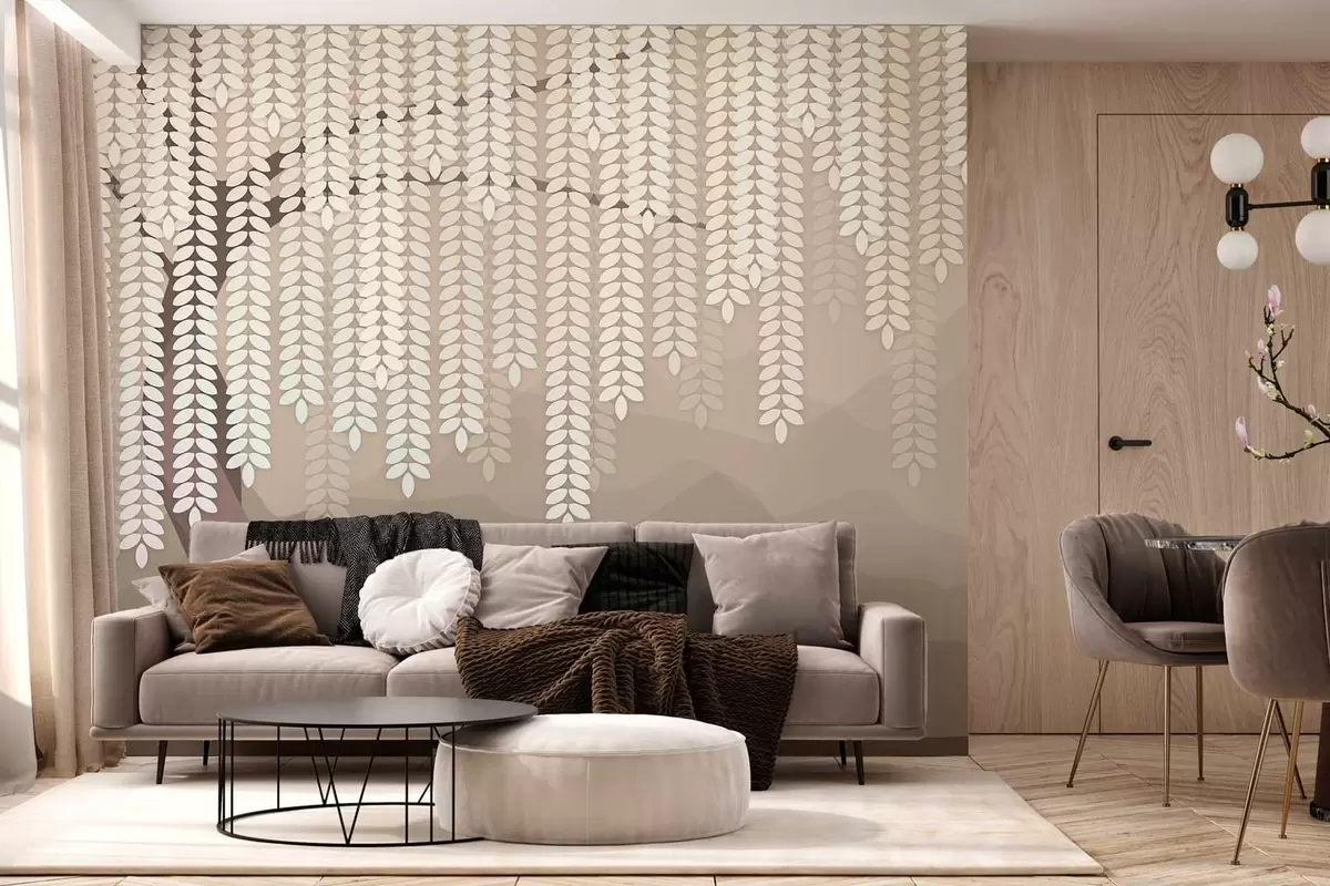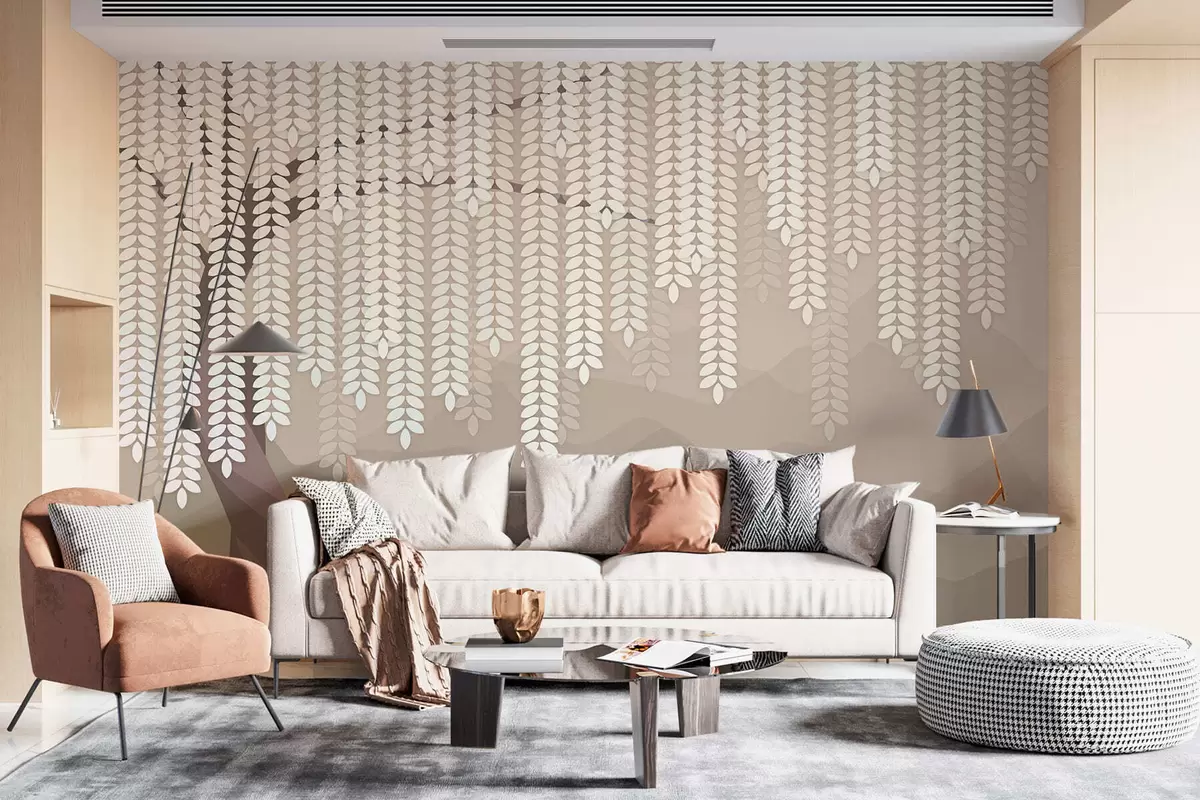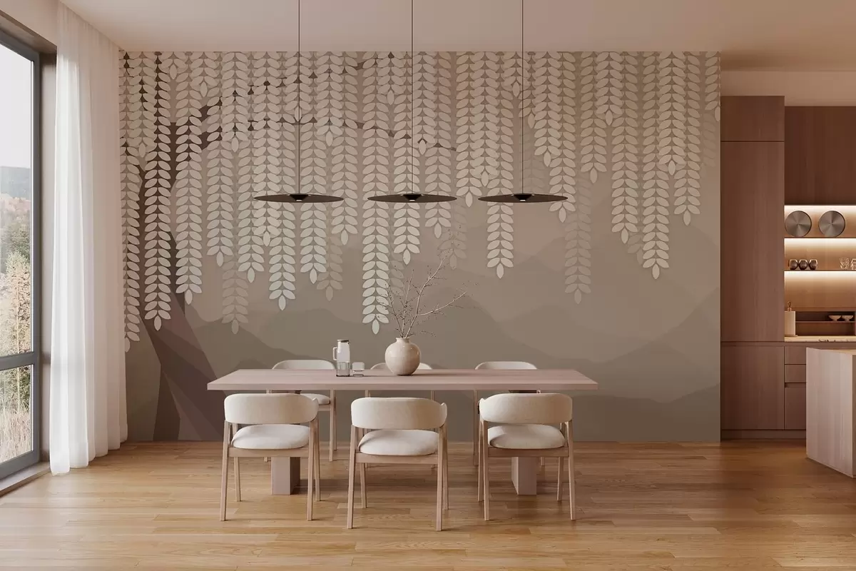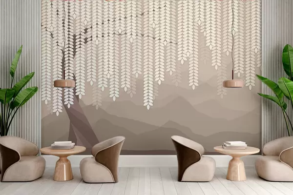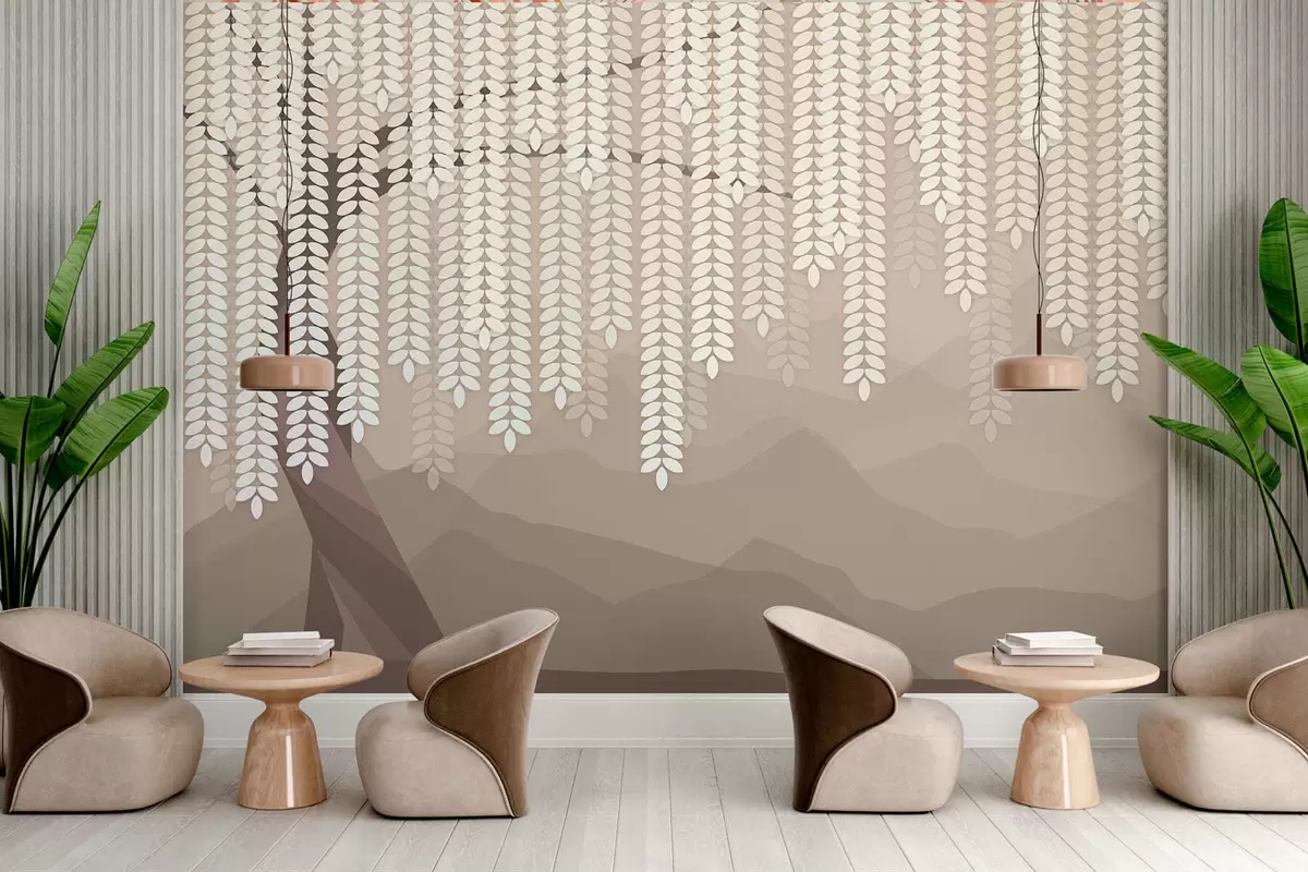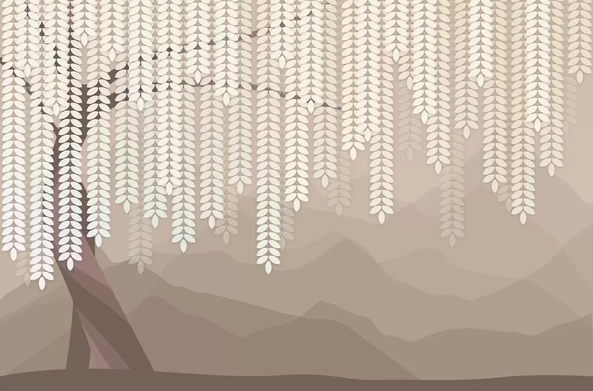 Fototapeten Stilisierter Weidenbaum mit herabhängenden Blättern vor dem Hintergrund minimalistischer Berge in Kaffeetönen N° w05232v2