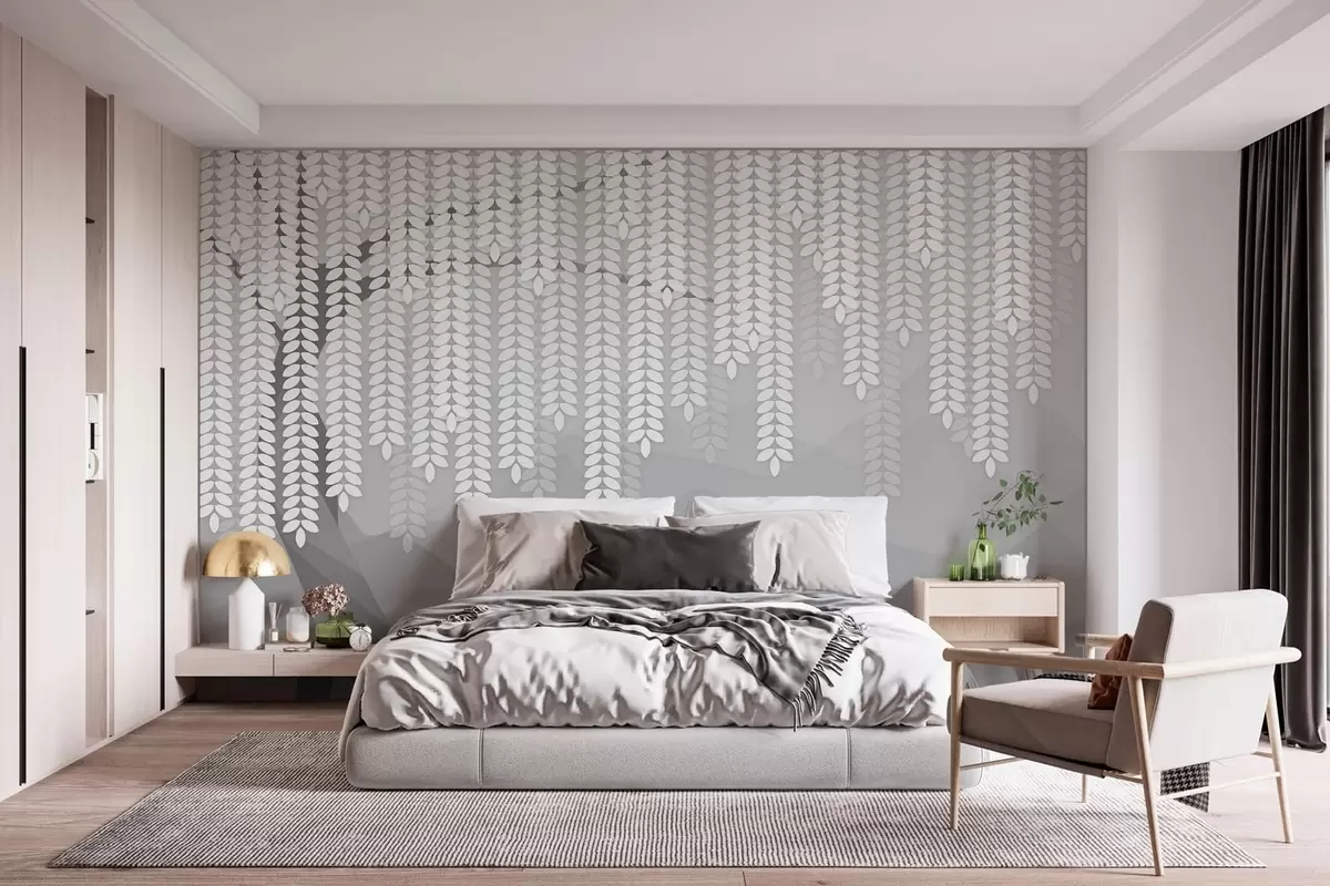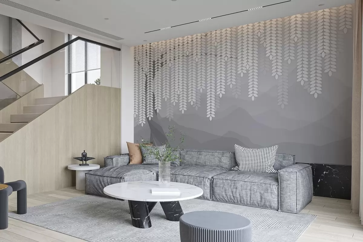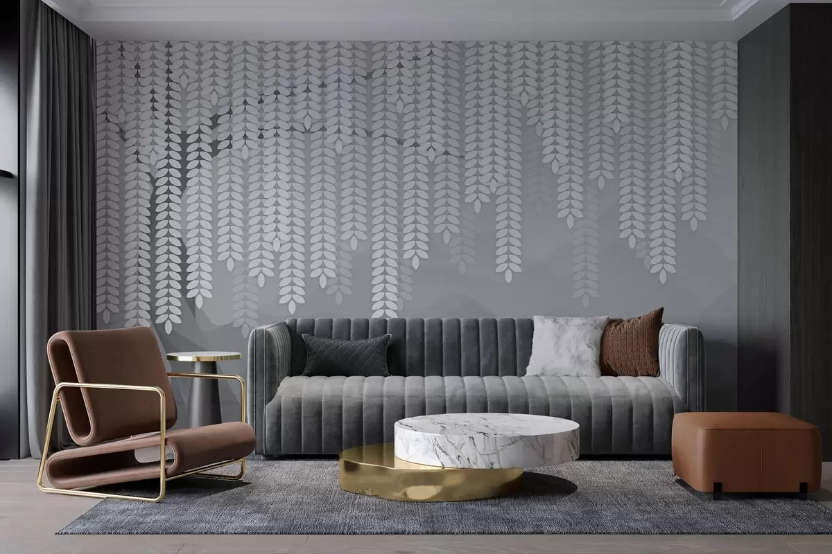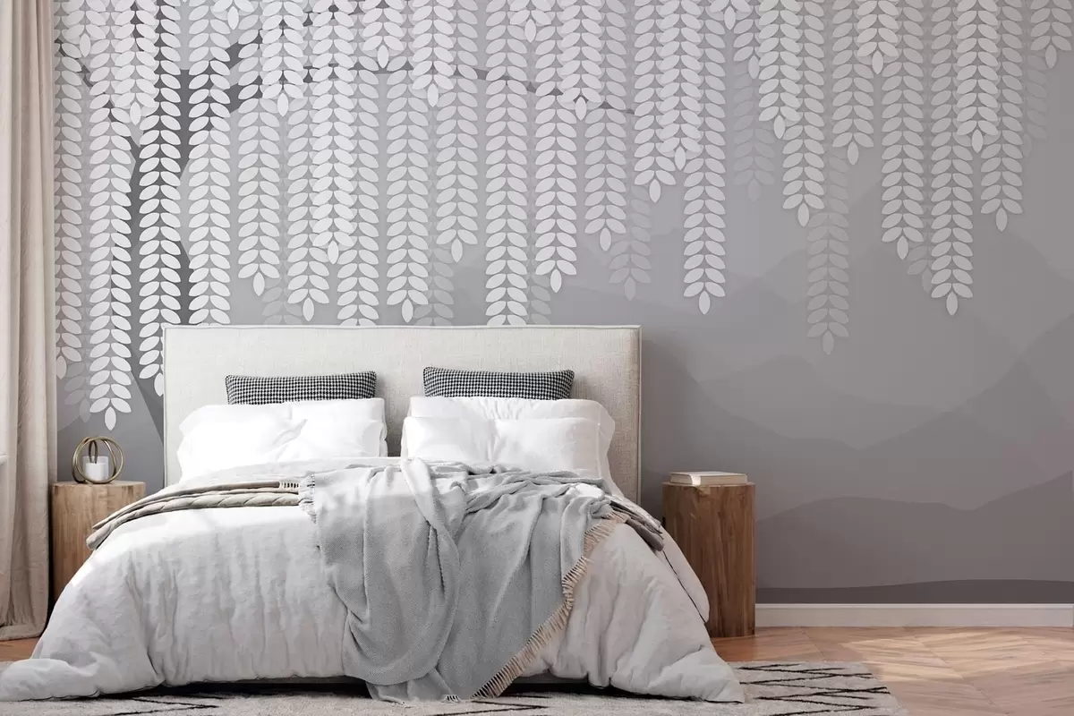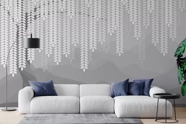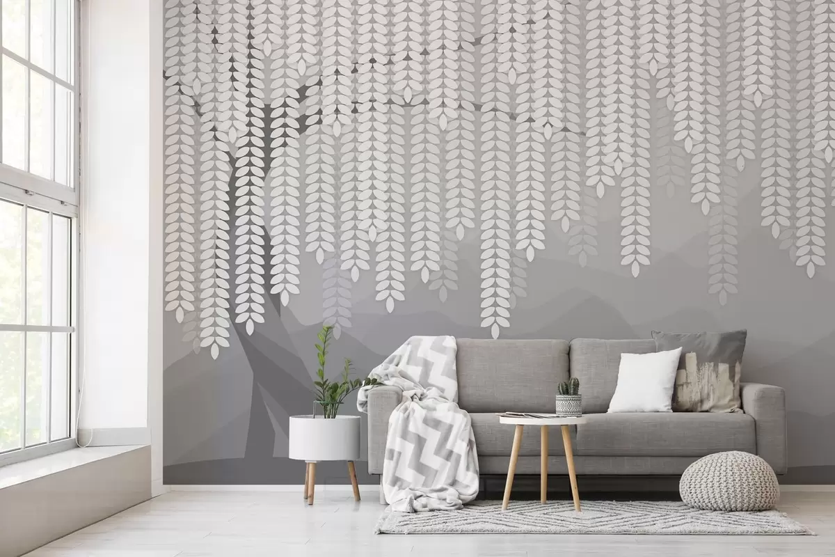 Fototapeten Stilisierter Weidenbaum mit herabhängenden Blättern vor dem Hintergrund minimalistischer Berge in Grautönen N° w05232v3