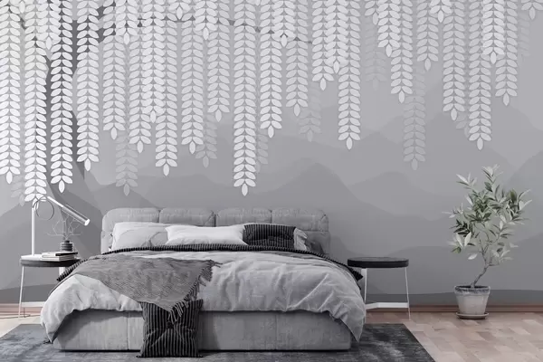 Fototapeten Stilisierter Weidenbaum mit herabhängenden Blättern vor dem Hintergrund minimalistischer Berge in Grautönen N° w05232v3