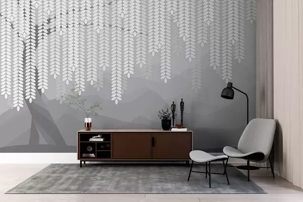 Fototapeten Stilisierter Weidenbaum mit herabhängenden Blättern vor dem Hintergrund minimalistischer Berge in Grautönen N° w05232v3