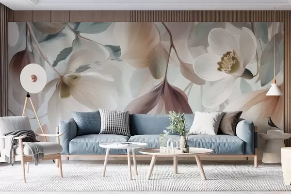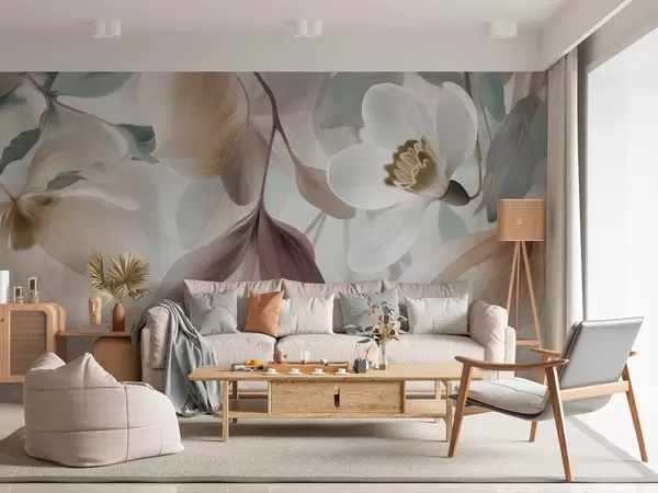 Fototapeten eine zarte Komposition aus Blumen und Blättern in Pastelltönen N° w05240