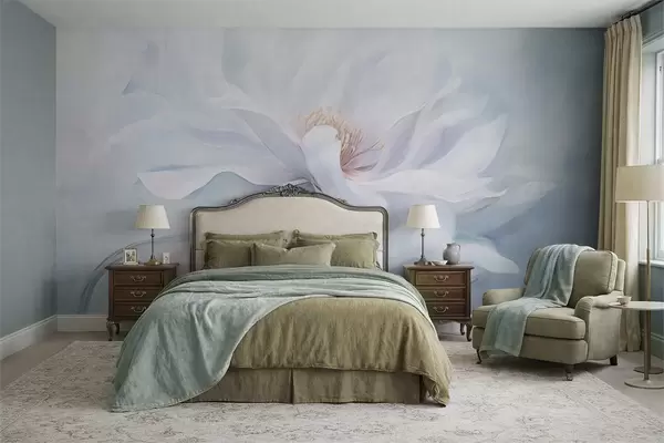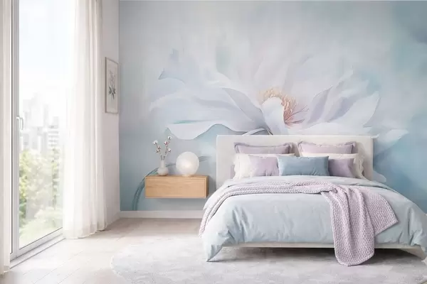 Fototapeten Zarte weiße Blume mit fließenden Blütenblättern auf blauem Hintergrund N° w05354