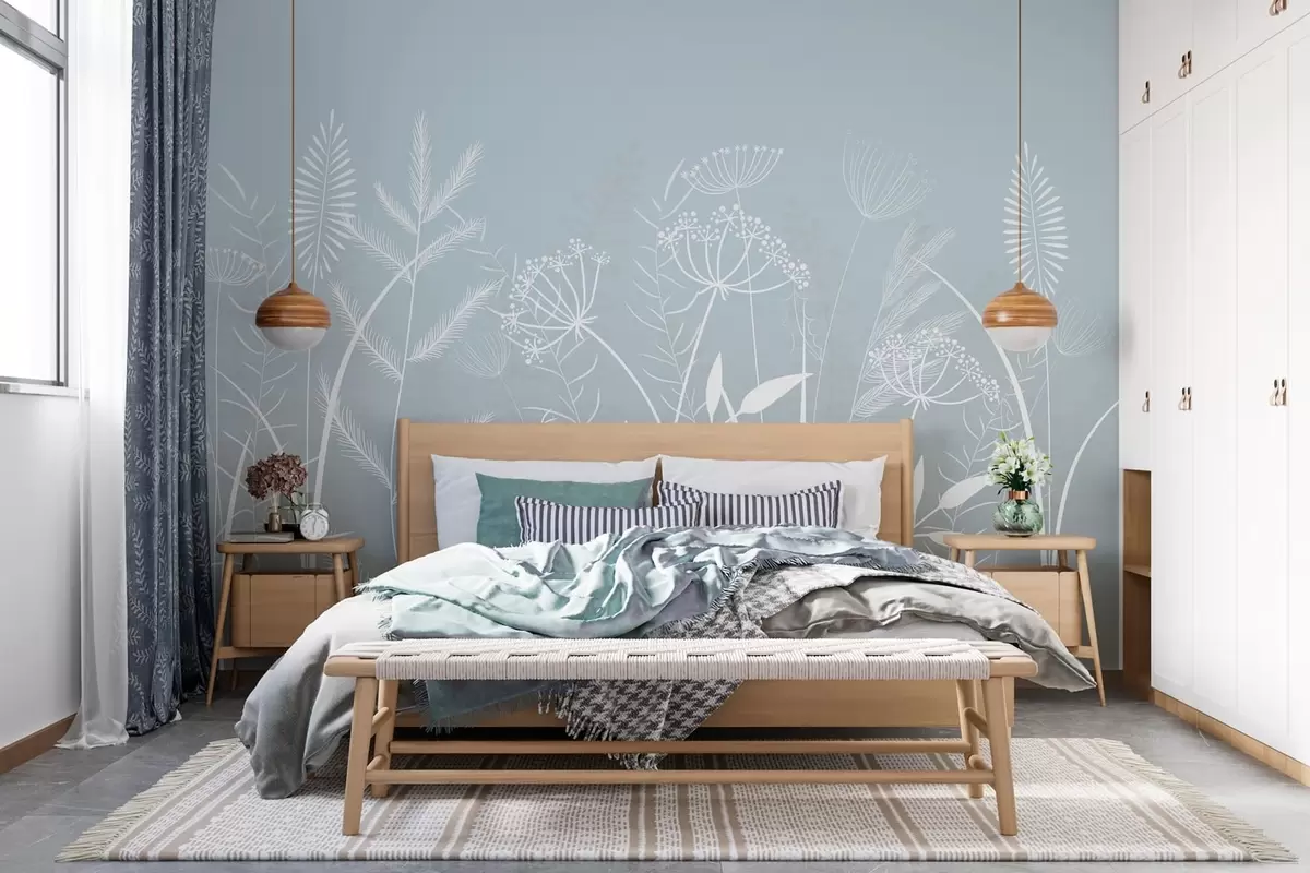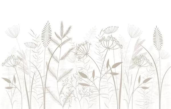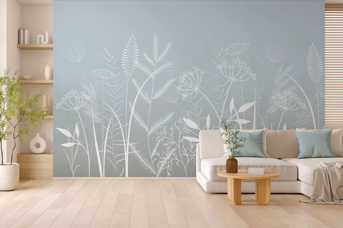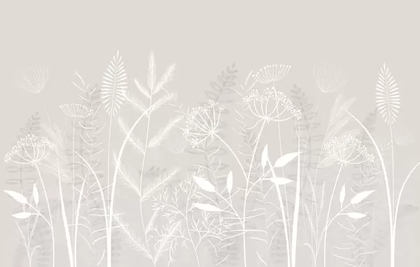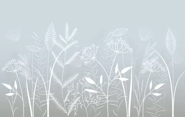 Fototapeten zarte, handgemalte Wildgräser und Blumen vor einem graublauen Hintergrund N° w05383