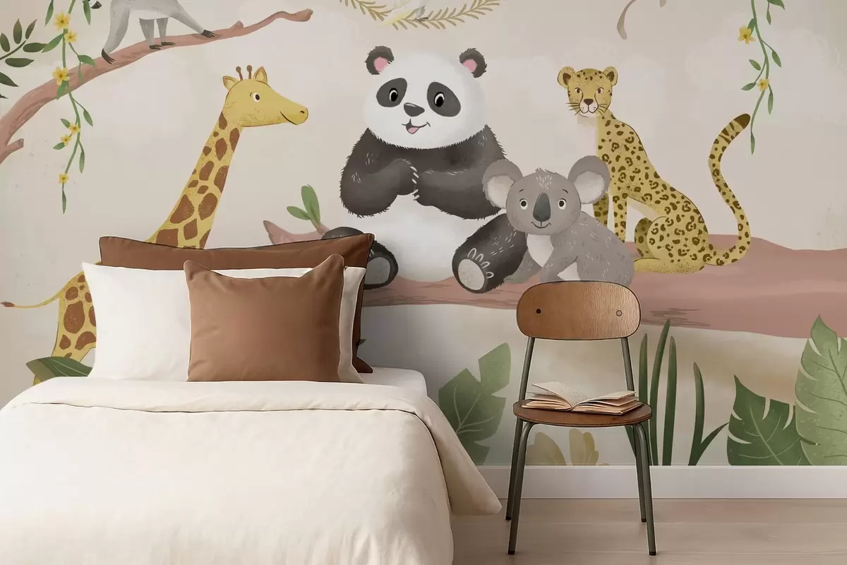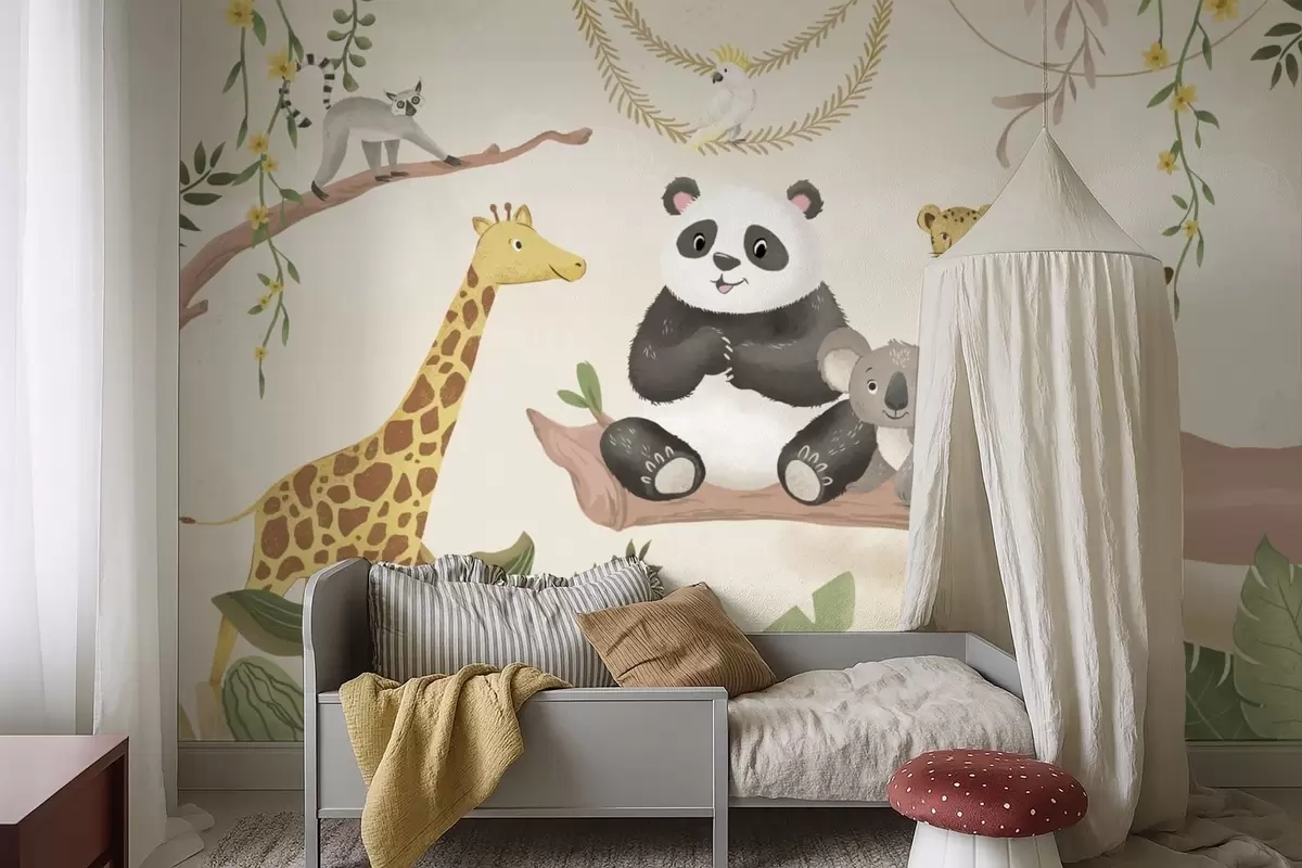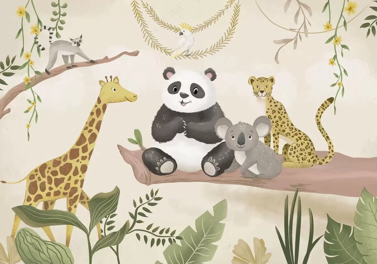 Fototapeten Niedliche Dschungeltiere auf einem Ast inmitten von Pflanzen N° w05393