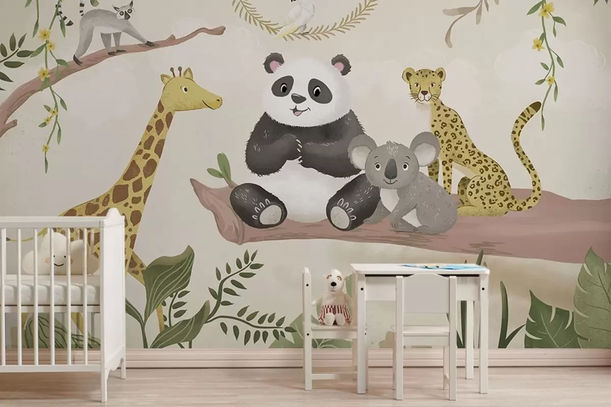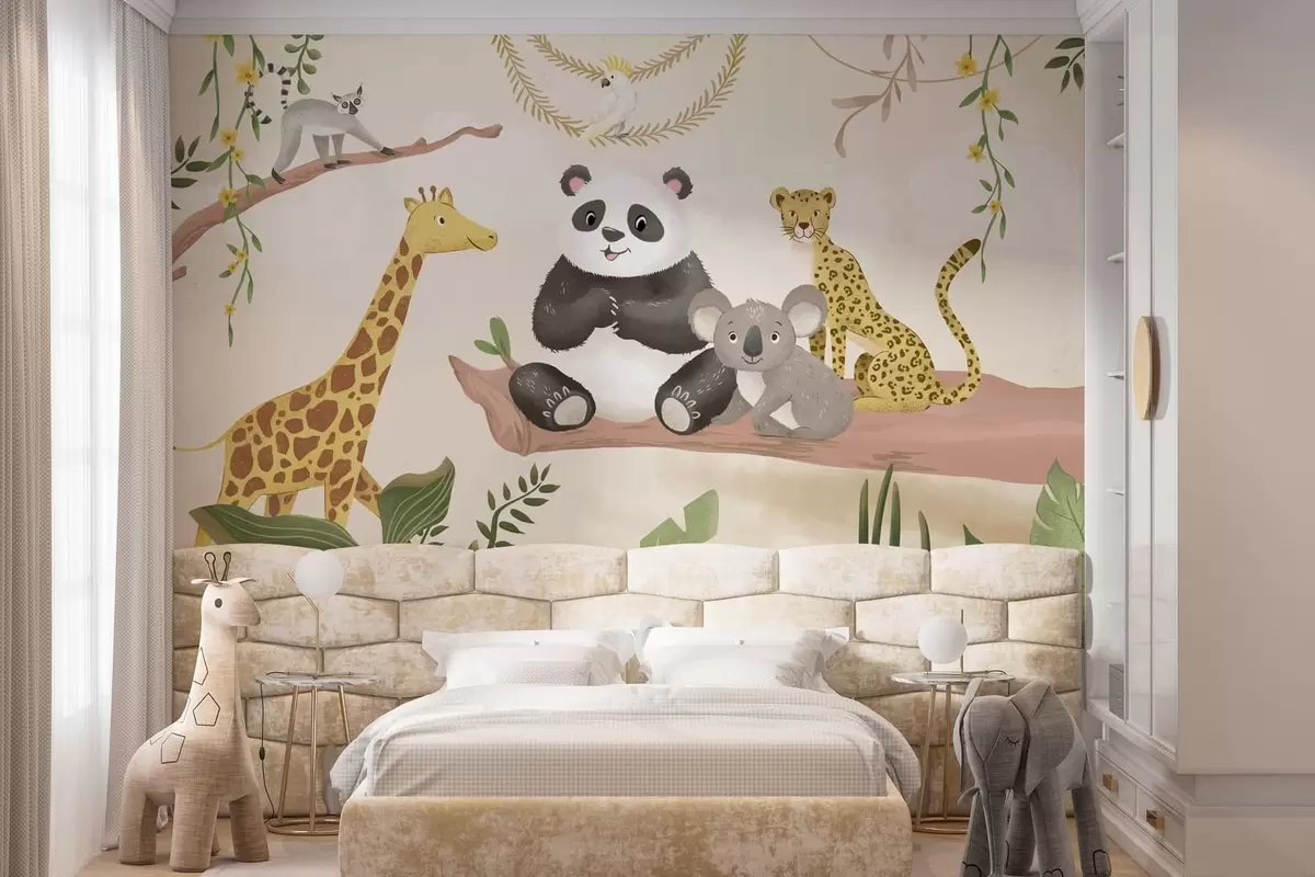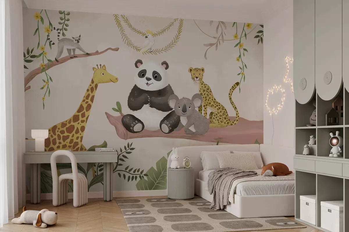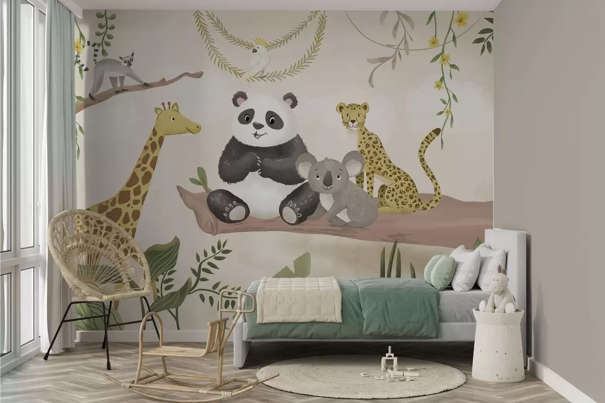 Fototapeten Niedliche Dschungeltiere auf einem Ast inmitten von Pflanzen N° w05393