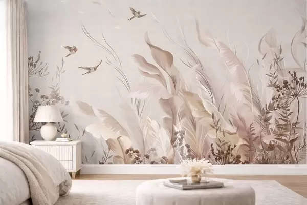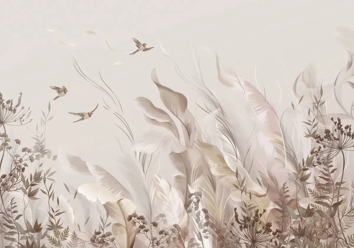 Fototapeten Zarte Federn, Gräser und Vögel in hellen Farbtönen N° w05395