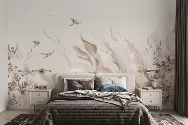 Fototapeten Zarte Federn, Gräser und Vögel in hellen Farbtönen N° w05395