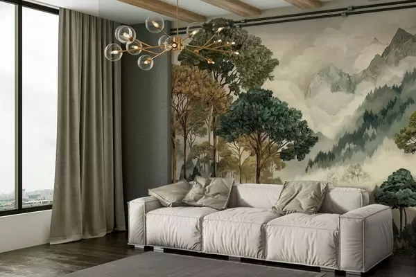 Fototapeten Wald mit hohen Bäumen in nebligen Bergen N° w05410
