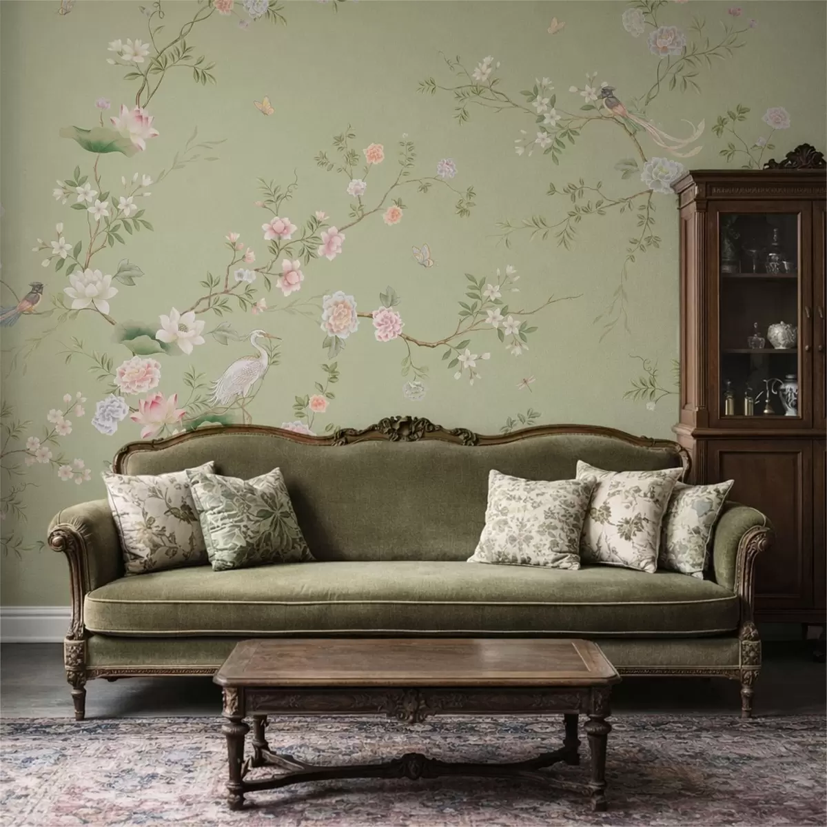 Fototapeten Blühende Zweige mit Vögeln auf hellgrünem Hintergrund N° w05416