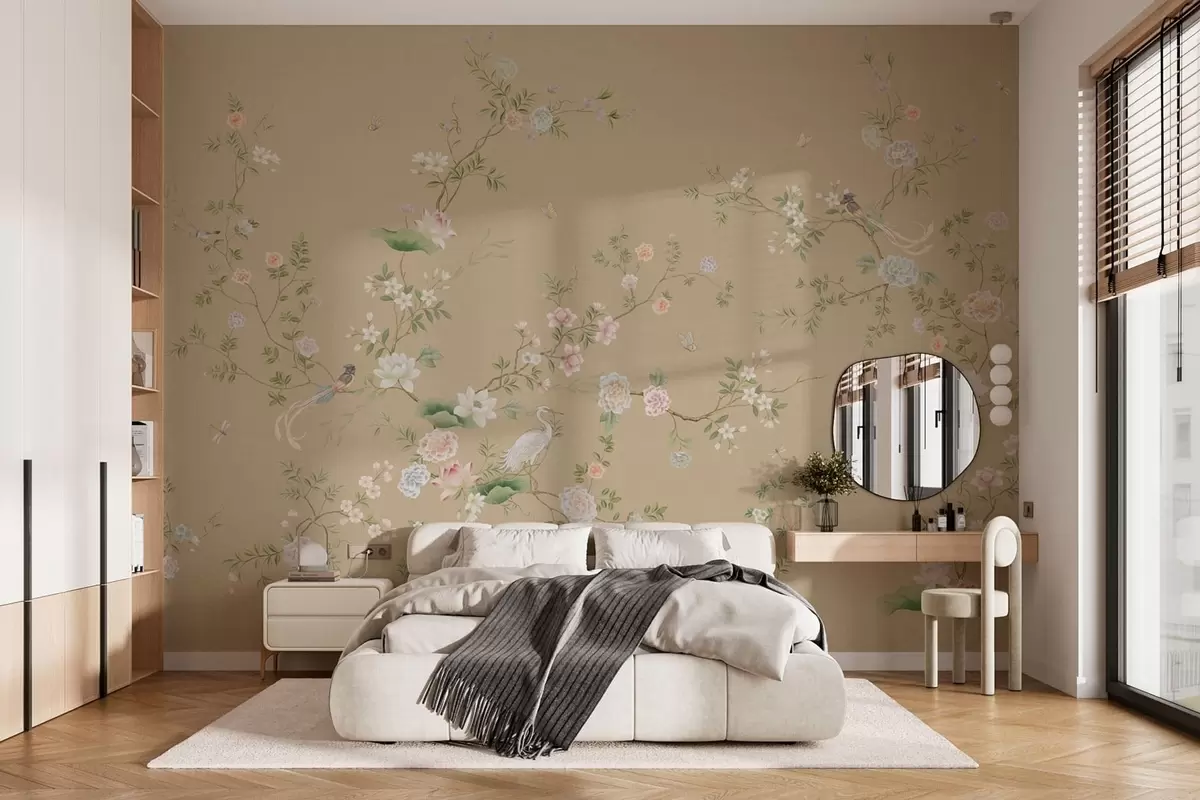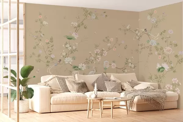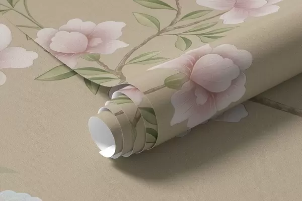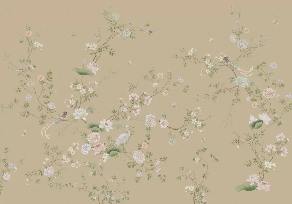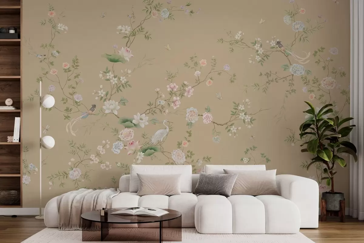 Fototapeten Blühende Zweige mit Vögeln auf warmem Beige N° w05416v2