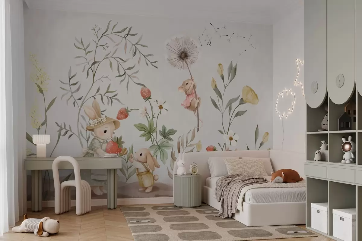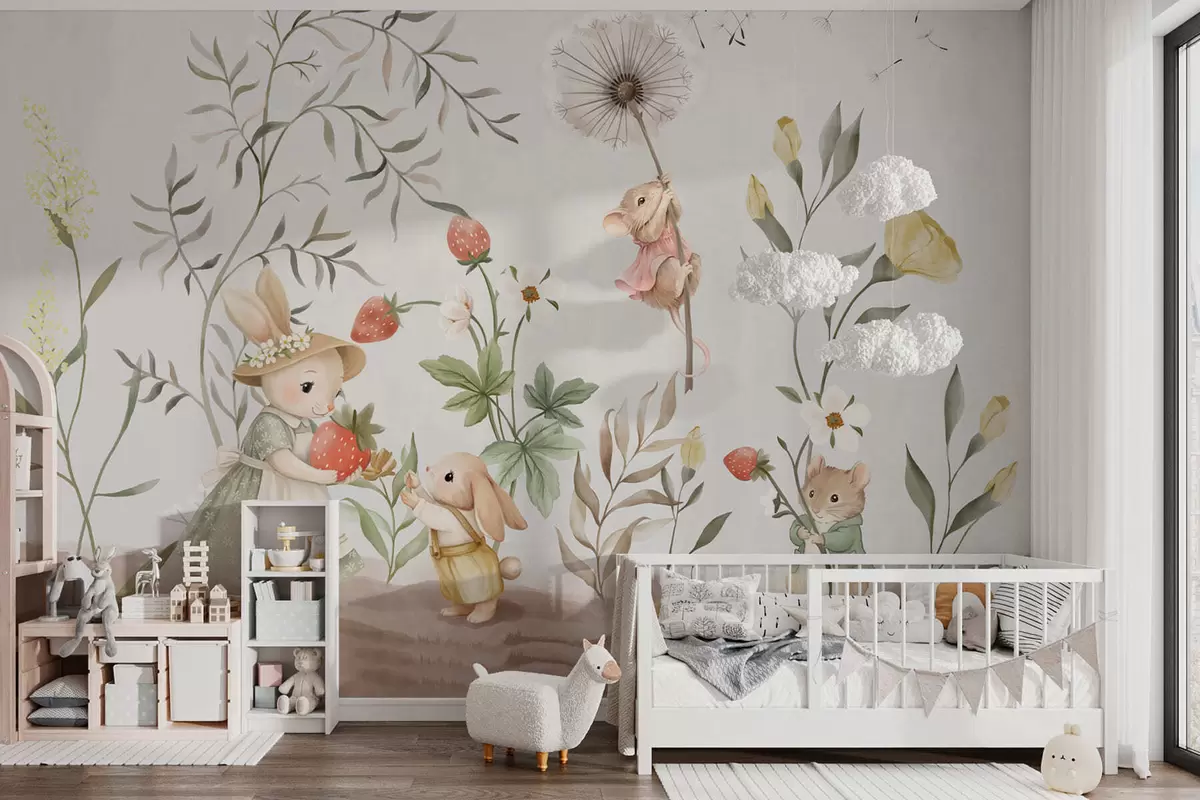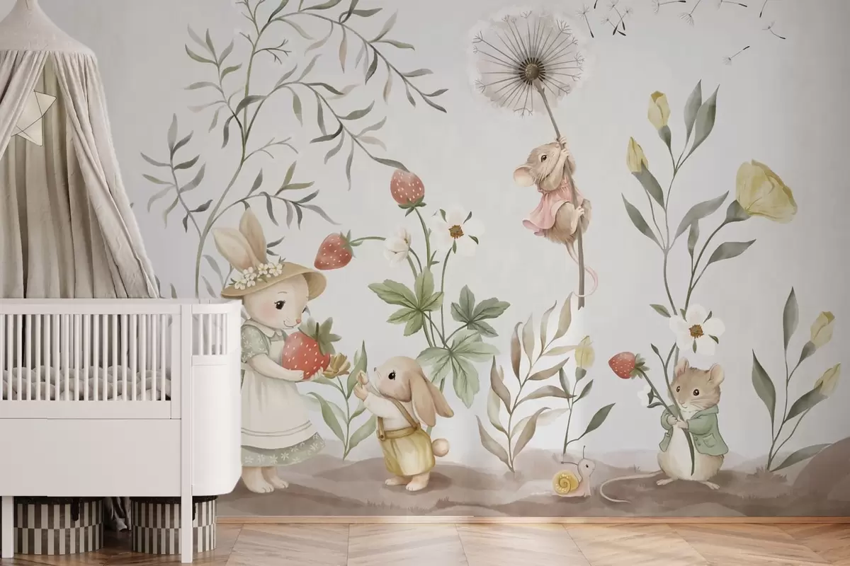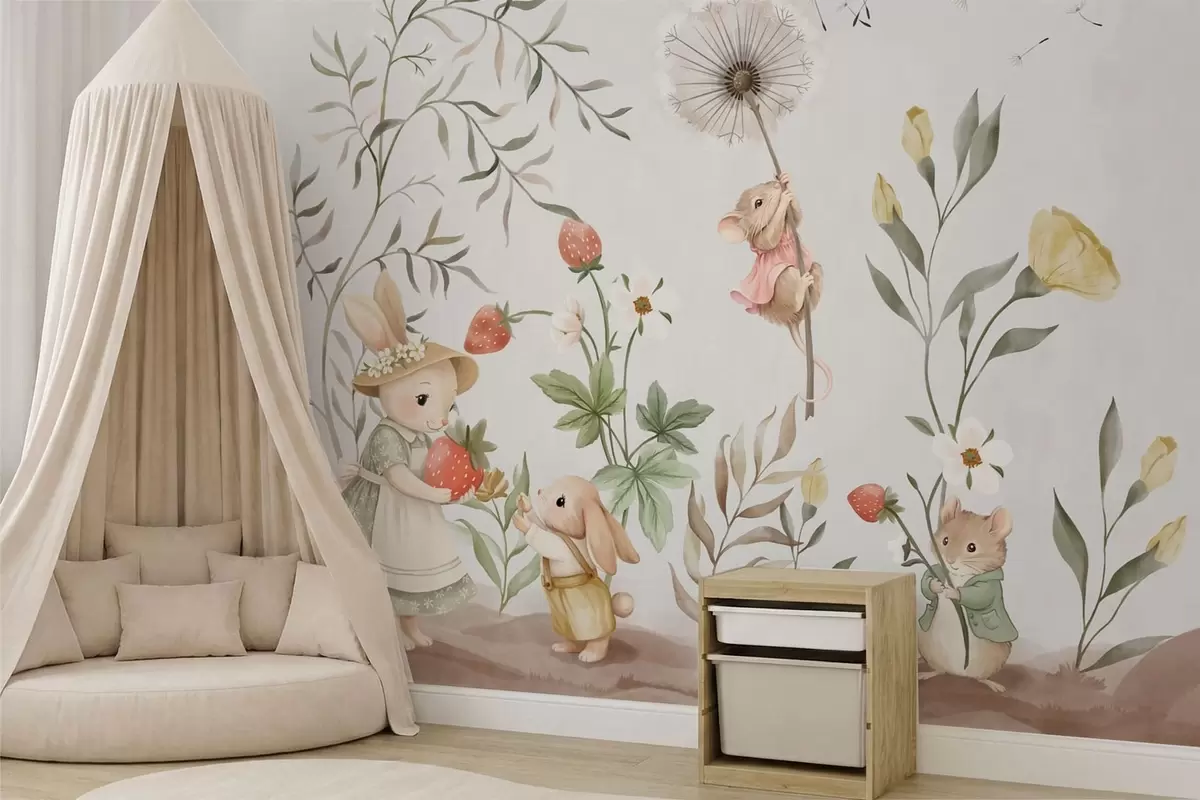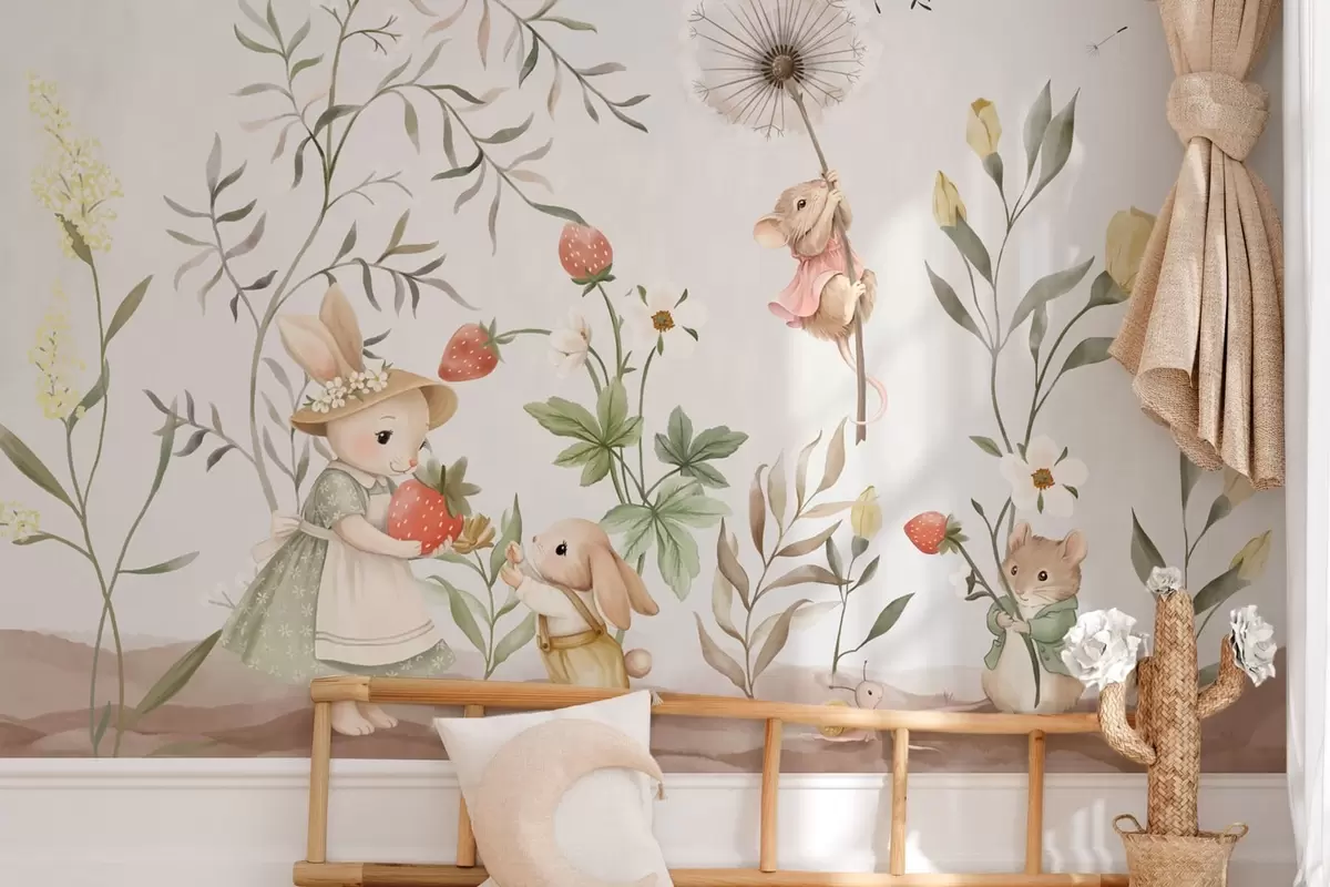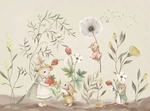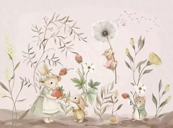 Fototapeten Kinderillustration mit einem Hasen und einer Maus zwischen Pflanzen und Blumen N° w05422