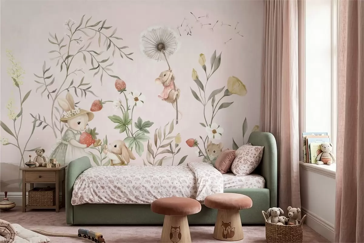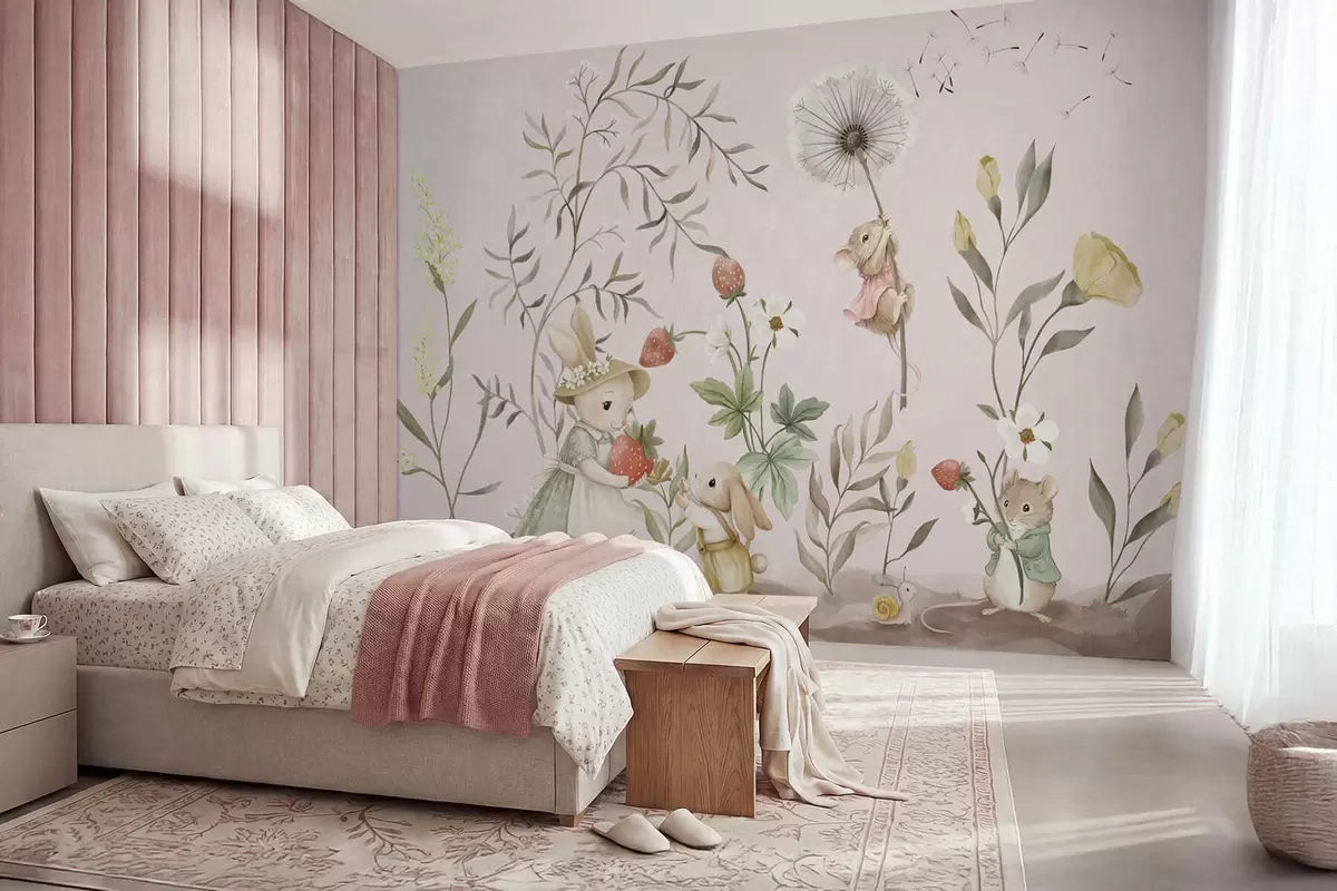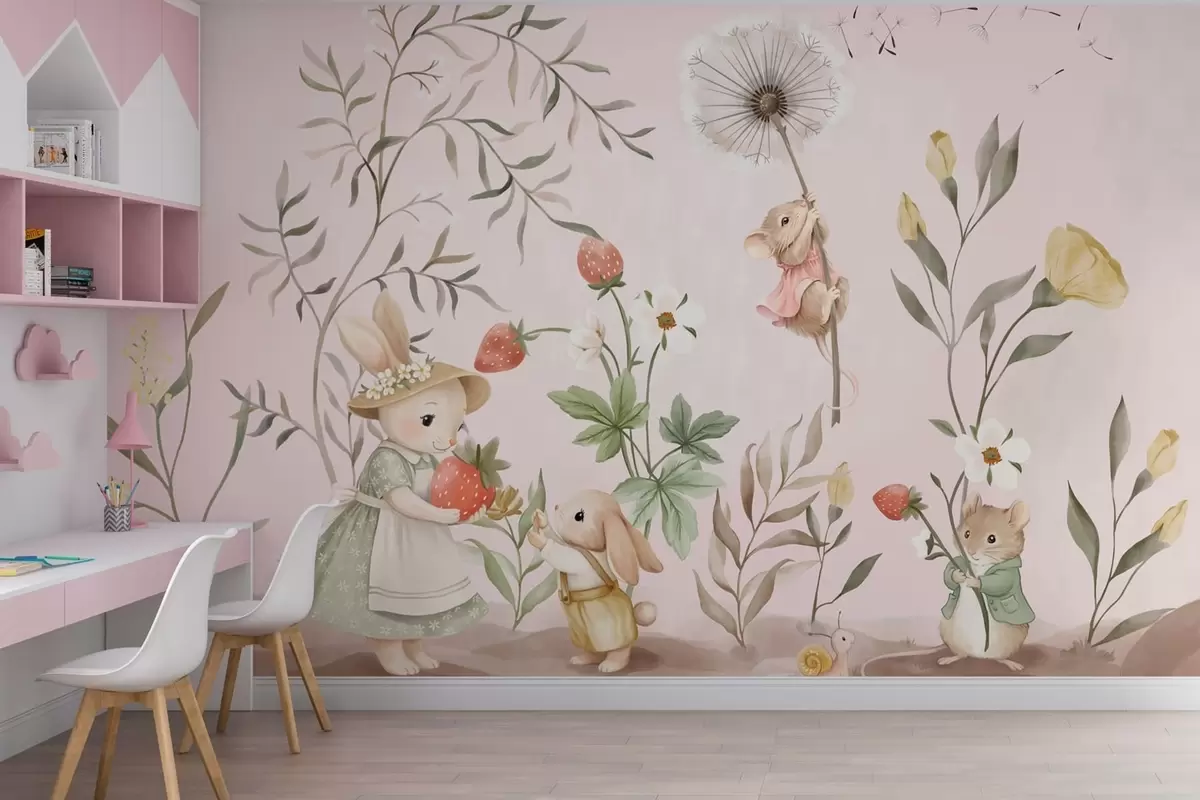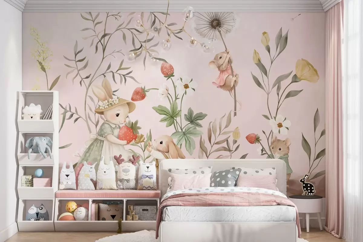Fototapeten Illustration von Tieren mit Erdbeeren auf zartrosa Hintergrund N° w05422v1