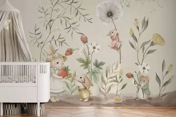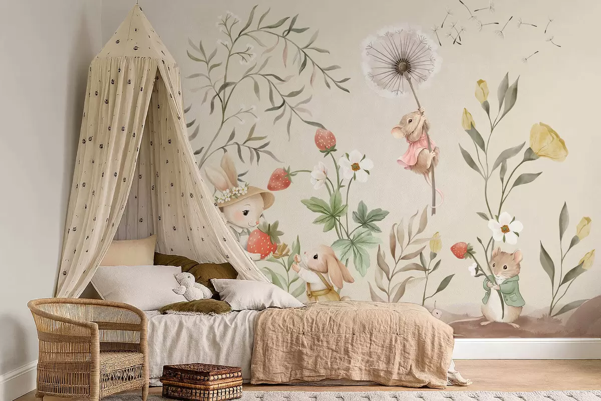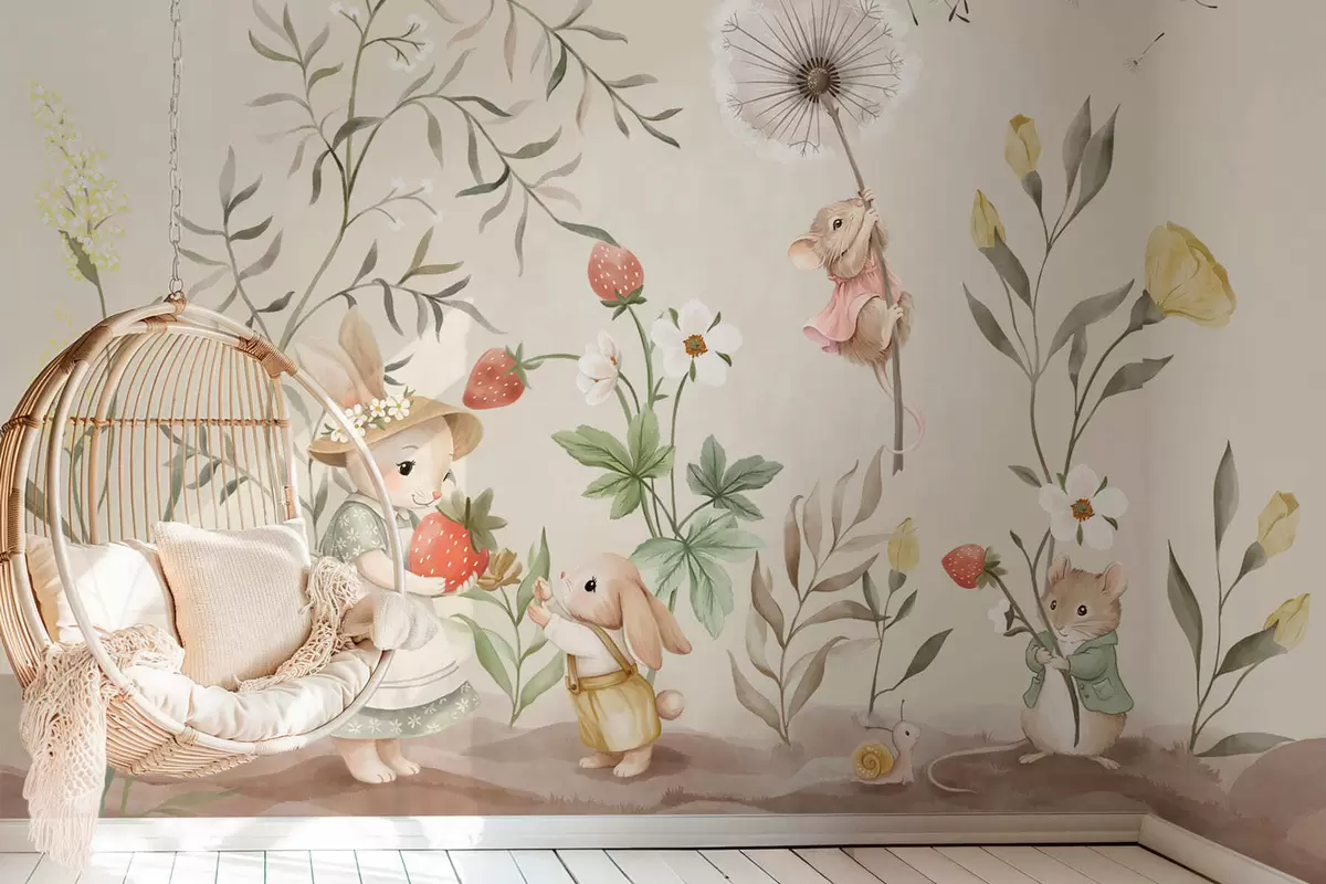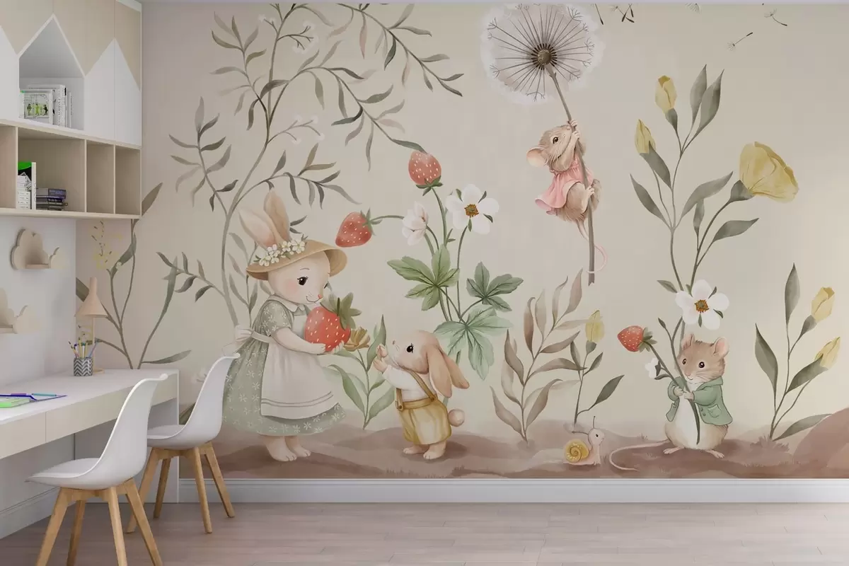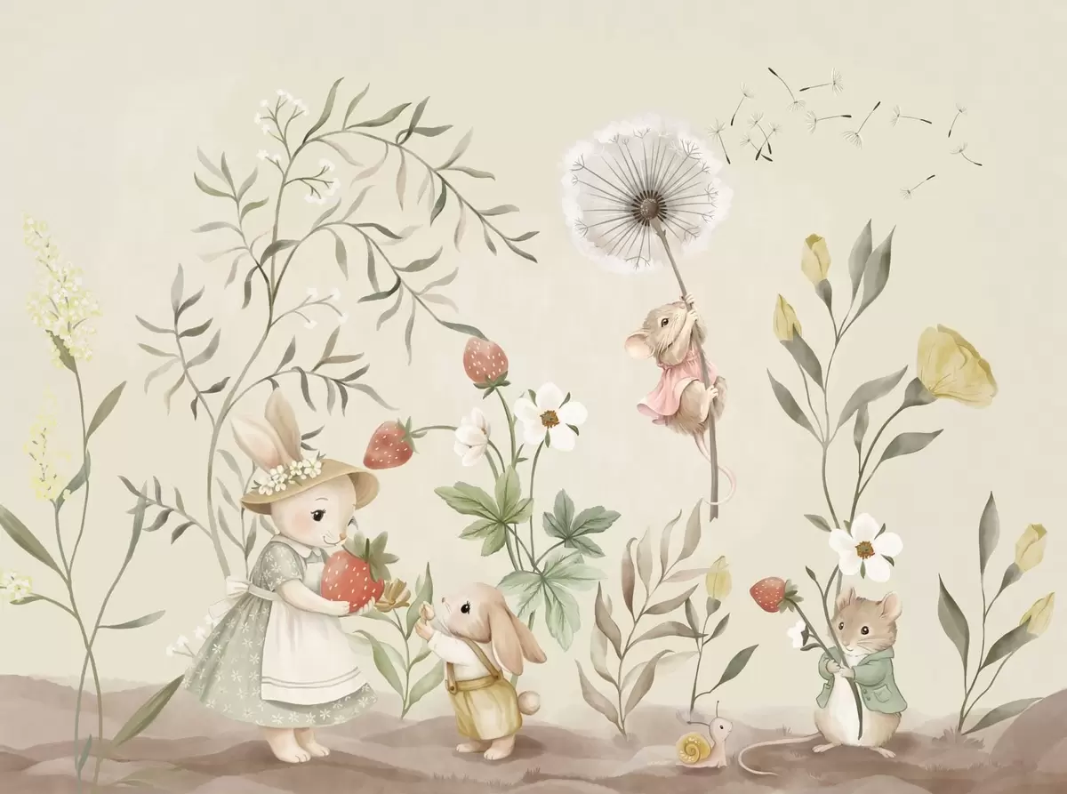 Fototapeten Illustration eines Hasen, einer Maus und Pflanzen mit Erdbeeren N° w05422v2