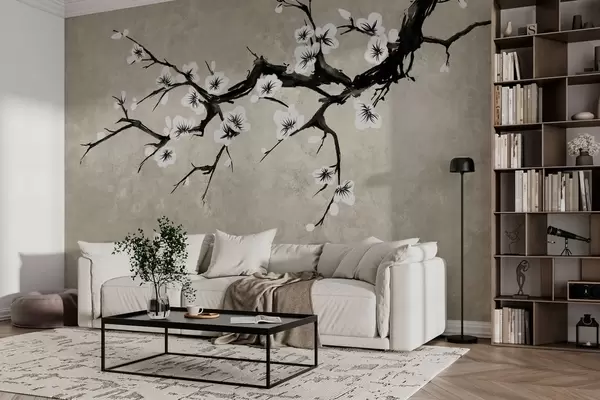 Fototapeten Zweig mit weißen Blüten im minimalistischen Stil N° w05425