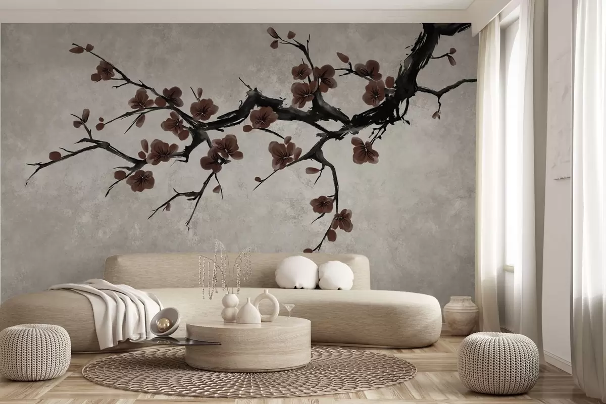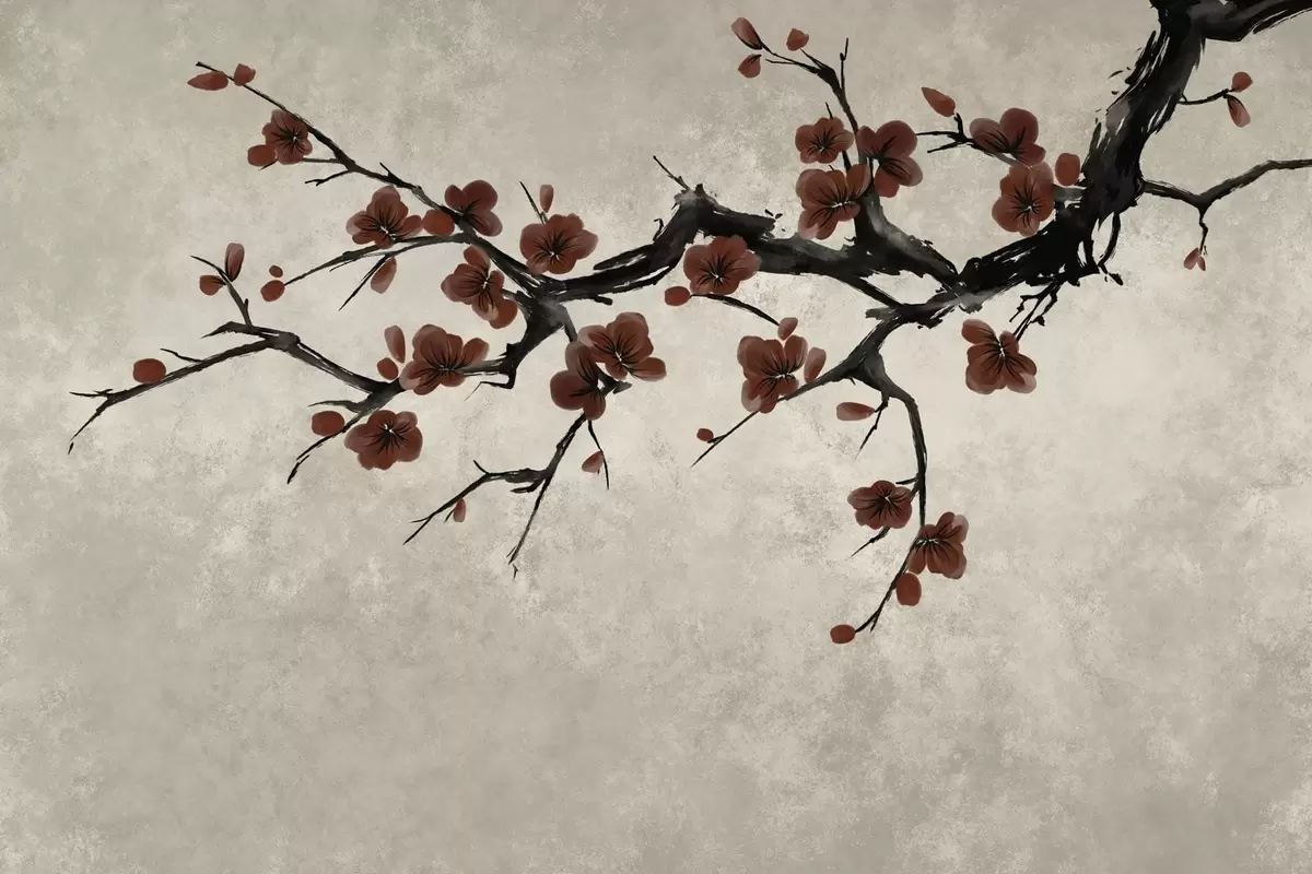 Fototapeten Zweig mit dunkelroten Blüten vor neutralem Hintergrund N° w05425v1
