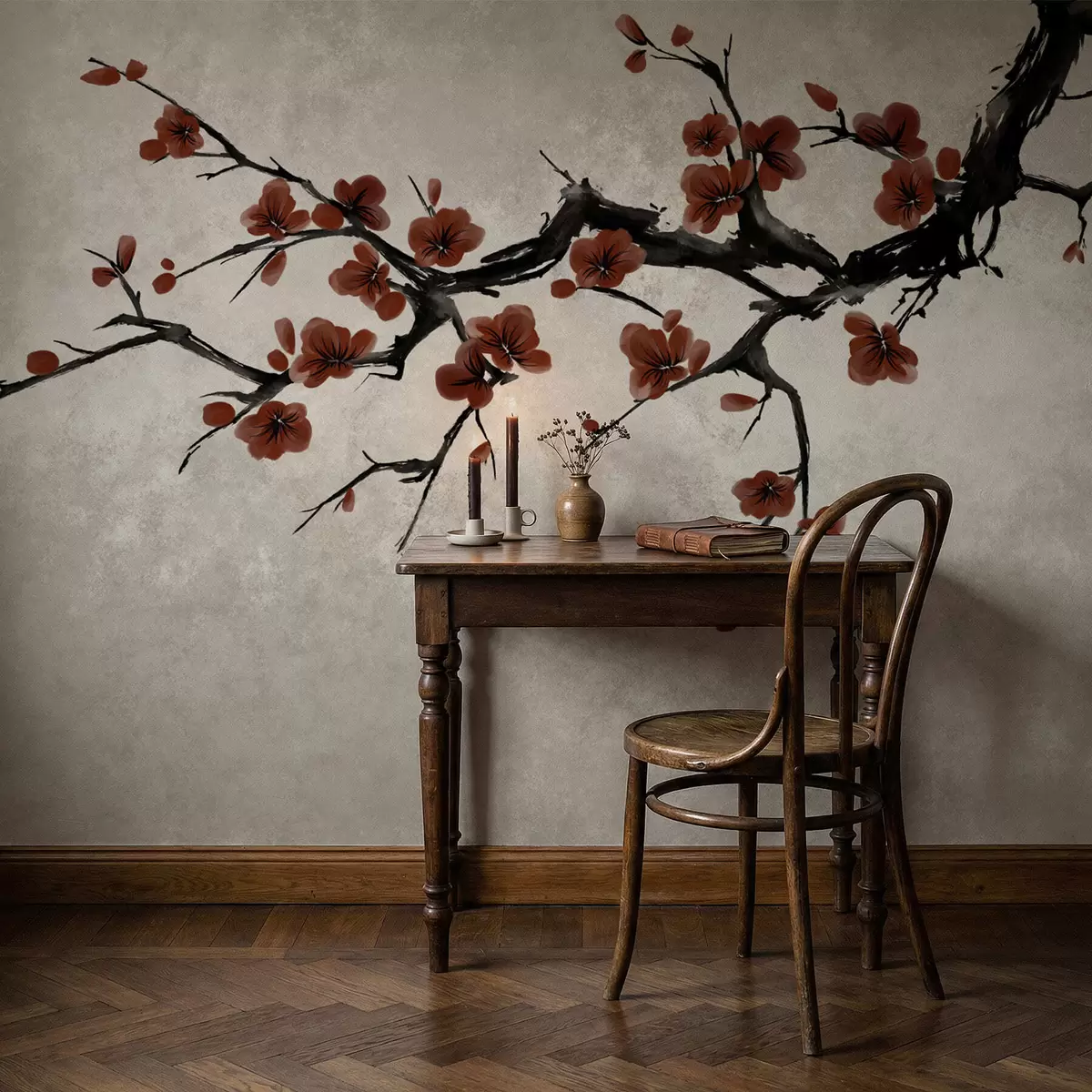 Fototapeten Zweig mit dunkelroten Blüten vor neutralem Hintergrund N° w05425v1