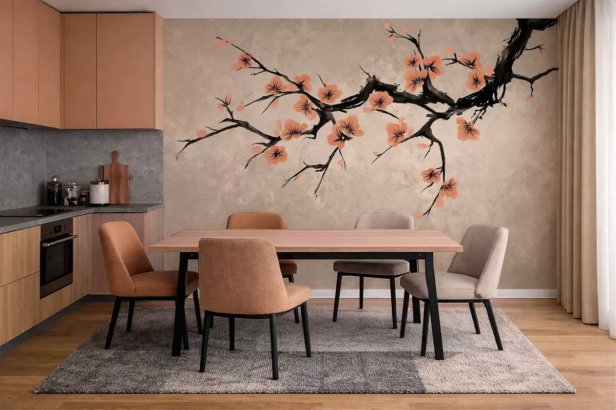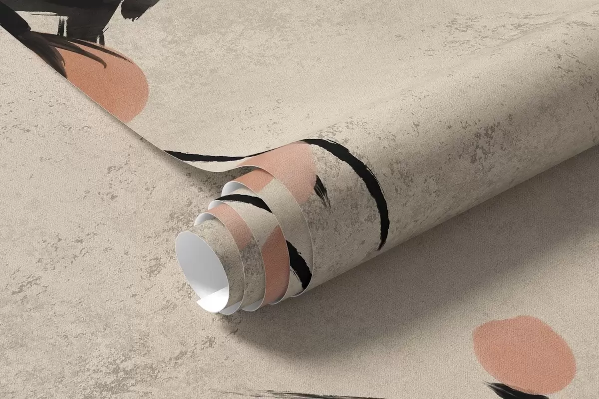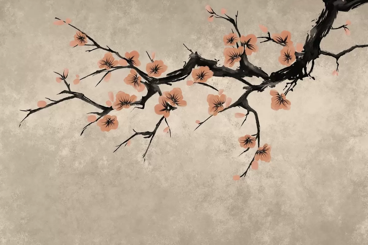 Fototapeten Zweig mit Pfirsichblüten vor strukturiertem Hintergrund N° w05425v3