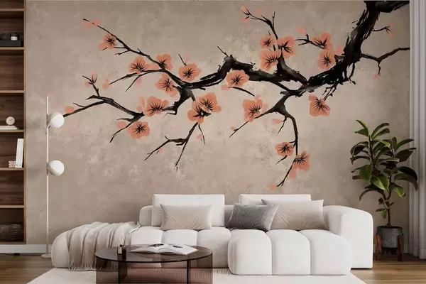 Fototapeten Zweig mit Pfirsichblüten vor strukturiertem Hintergrund N° w05425v3