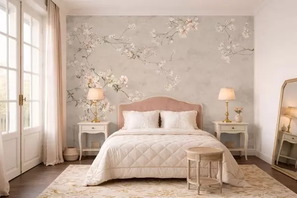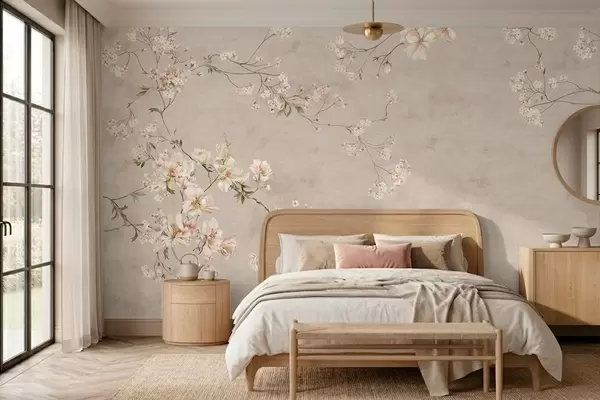 Fototapeten Zarte Blumenranken im Chinoiserie-Stil auf hellem Hintergrund N° w05427