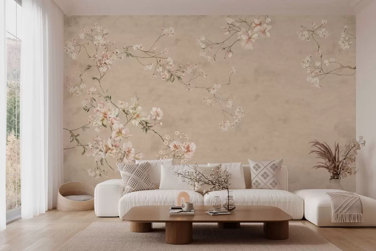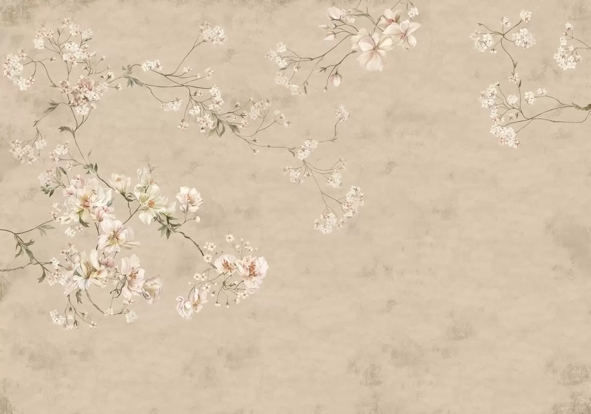 Fototapeten Blütenzweige im Chinoiserie-Stil auf warmem beigem Hintergrund N° w05427v2