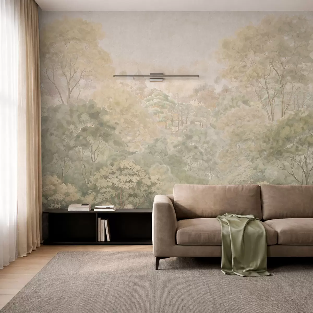 Fototapeten Eine Waldlandschaft im Vintage-Stil in gedämpften Grüntönen N° w05433
