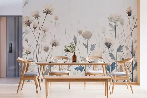 Fototapeten Wilde Wiesengräser und Blumen, gemalt im Landschaftsstil vor einem hellen Hintergrund N° w05563