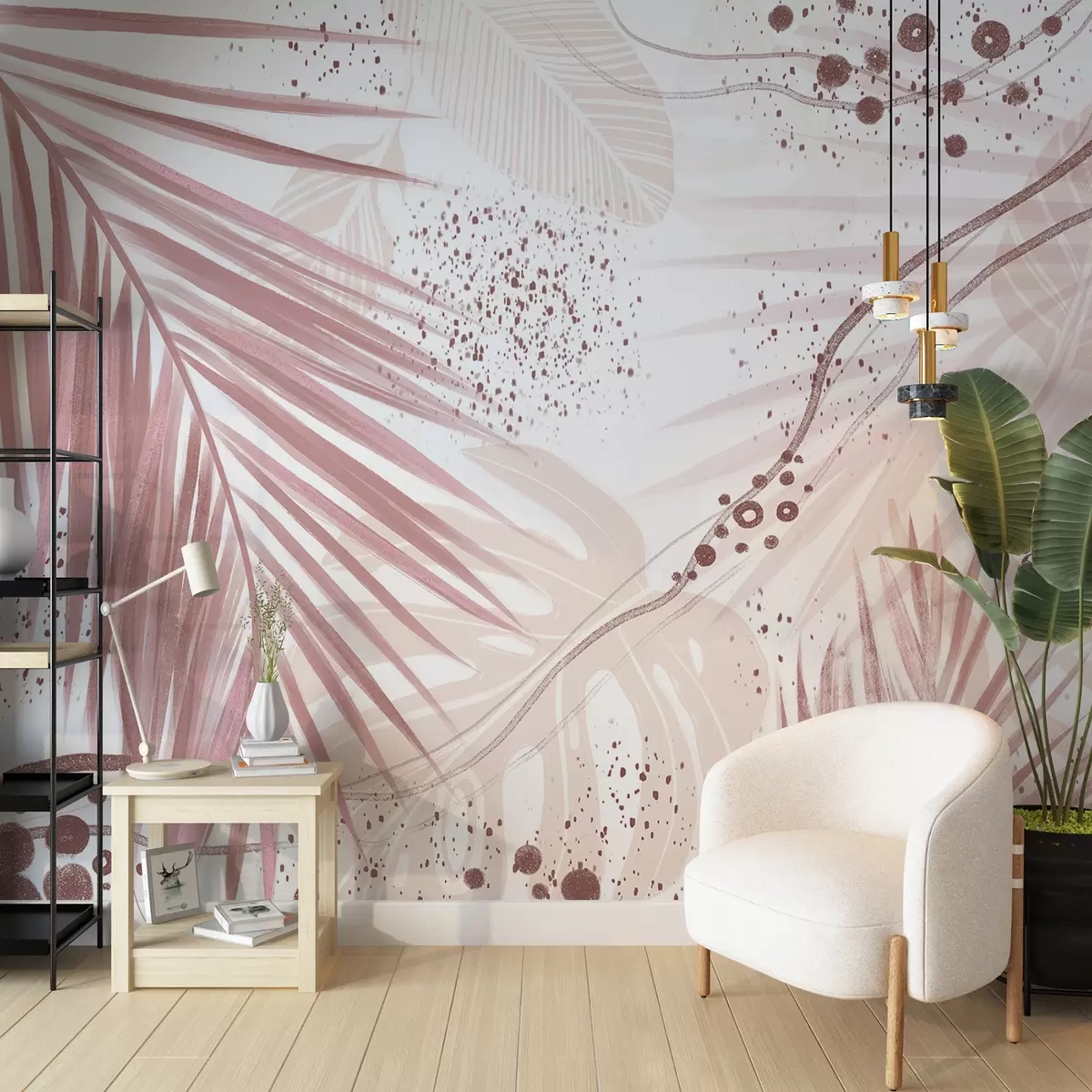Fototapeten Tropische rosa Palmblätter und Wedel mit abstrakten Formen und Spritzern in Rosa- und Weißtönen N° w07918v1
