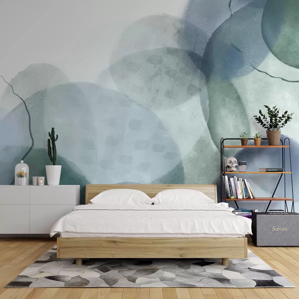 Fototapeten Weiche, abstrakte Aquarellformen in Blau-, Grün- und Weißtönen N° w07926