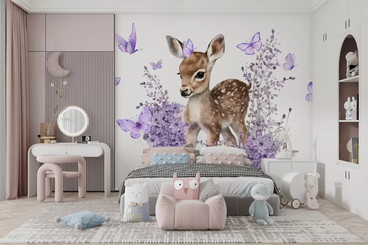 Fototapeten Ein junges Reh mit großen Augen und geflecktem Fell, umgeben von lila Blumen und Schmetterlingen N° w07931