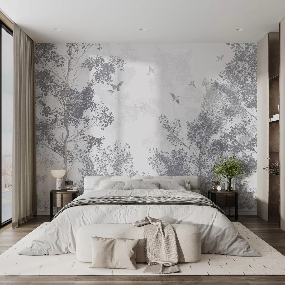 Fototapeten Bäume mit grauen Blättern und Zweigen mit Vögeln fliegen in den Himmel, weißer Hintergrund N° w07982v1