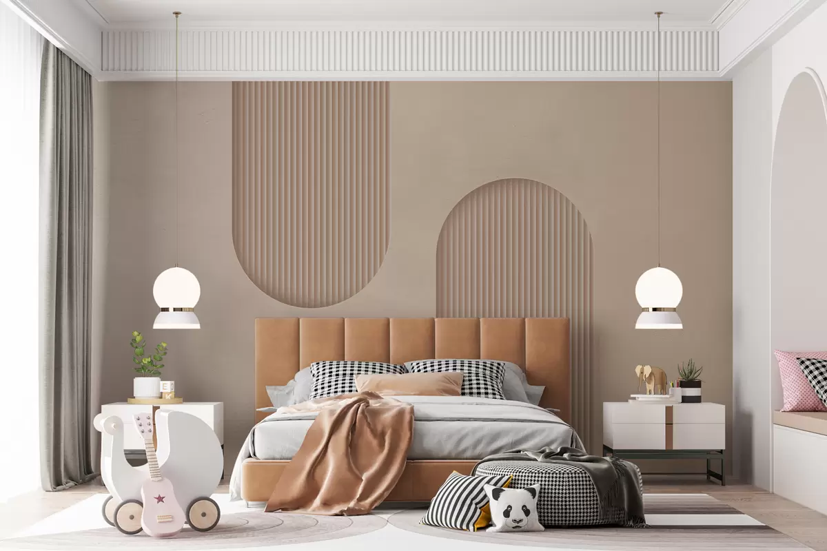 Fototapeten Strukturierte Tapete im Art-Deco-Stil in warmen Beigetönen. Nachahmung volumetrischer Bögen N° w08048