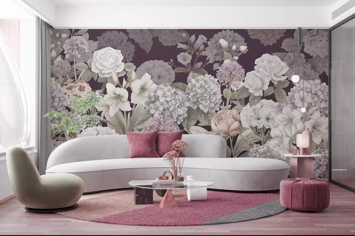 Fototapete Zauberhafter Sommergarten auf purpurrotem Hintergrund w08140v2