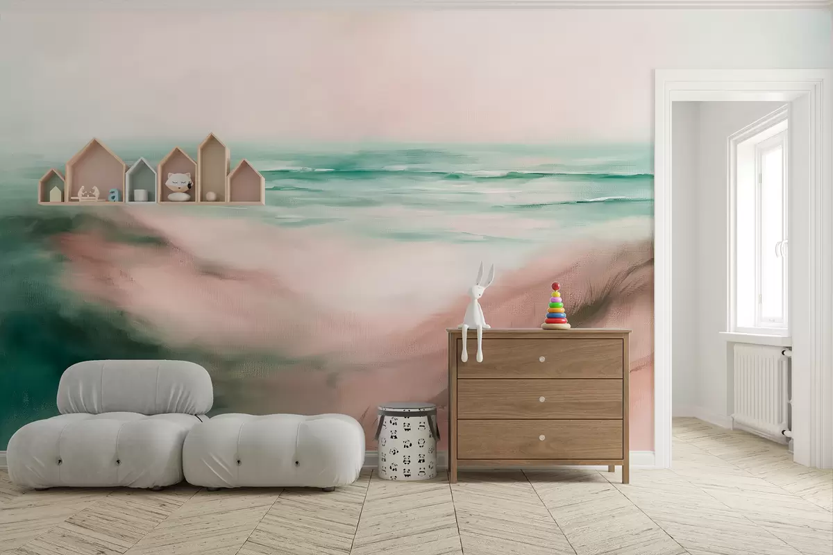 Fototapeten Abstrakte Landschaft in Pastellfarben, Strand, Meer, Aquamarin und Rosa, Pinselstriche N° w08141v2
