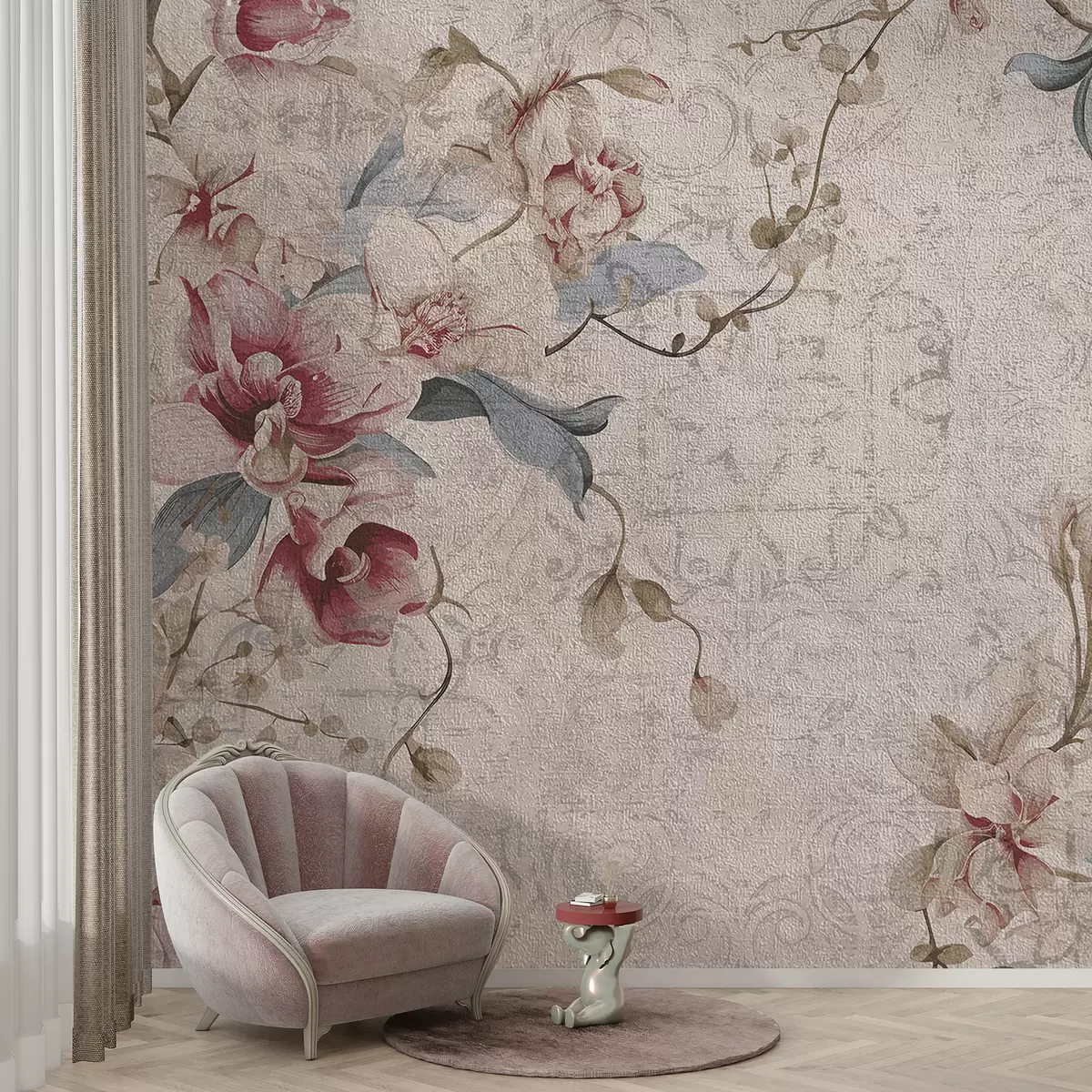 Fototapeten Ein Vintage-Blumenmuster mit zarten rosa und weißen Blüten, Blättern auf hellbeigem Hintergrund N° w08149