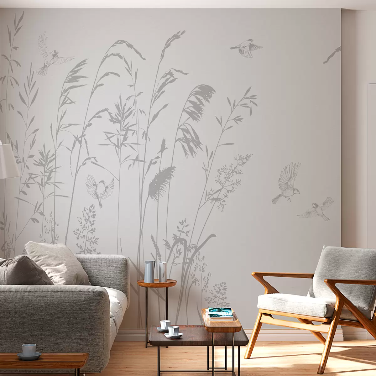 Fototapeten Pflanzen und kleine Vögel Natur Minimalismus graue Farbe N° w08172v1