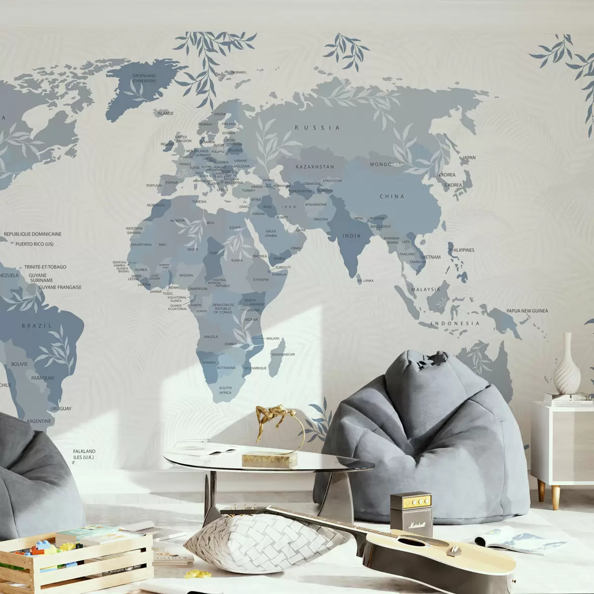 Fototapeten Stilvolle Weltkarte mit Blättern und Pflanzen in blauer Farbe N° w08211v4